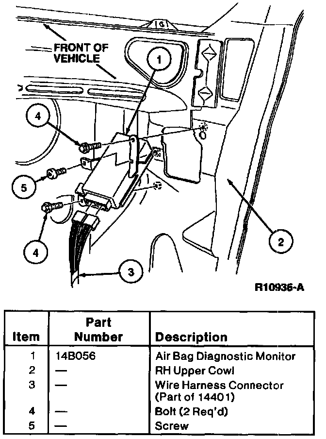 1. Install air bag diagnostic monitor on the RH upper cowl and secure with three retaining screws.