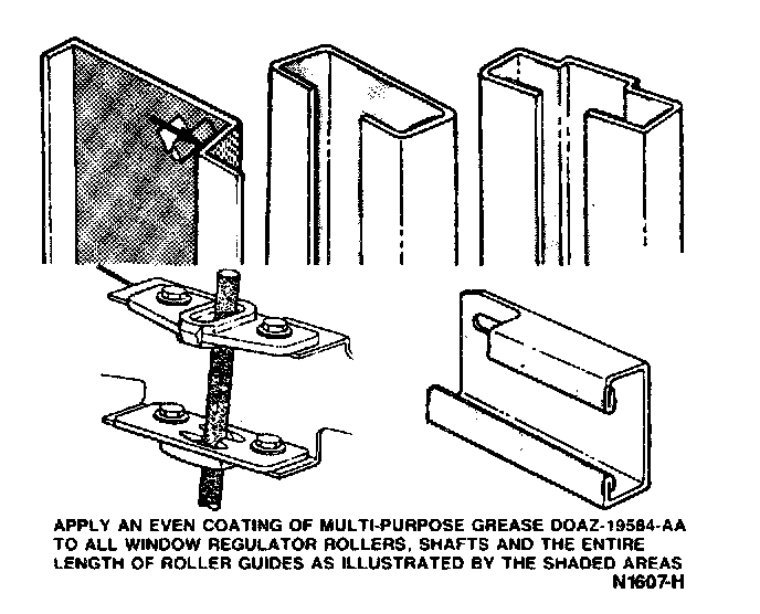 The door window mechanism should be well lubricated to provide ease of operation. The window glass mechanism should be lubricated whenever the glass channel or window regulator is removed, or excessive effort is required to operate the windows. To lubricate a door window mechanism, apply an even coating of Multi-Purpose Grease to the window regulator rollers, shafts and entire length of the roller guides.