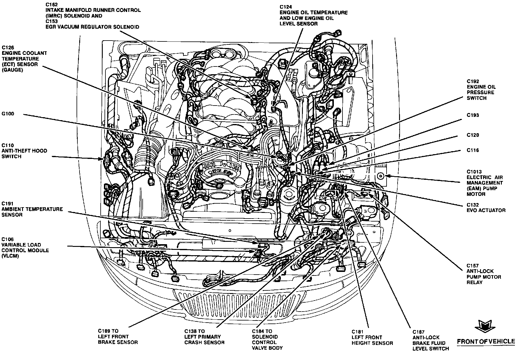 The Variable Load Control Module is located at the lower front center of the engine compartment.