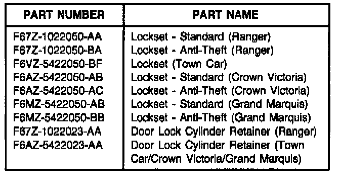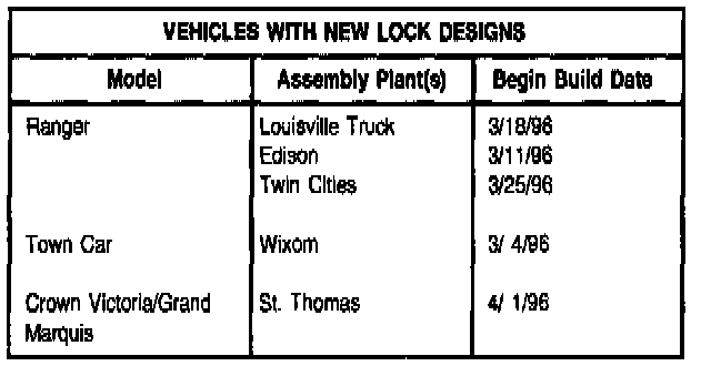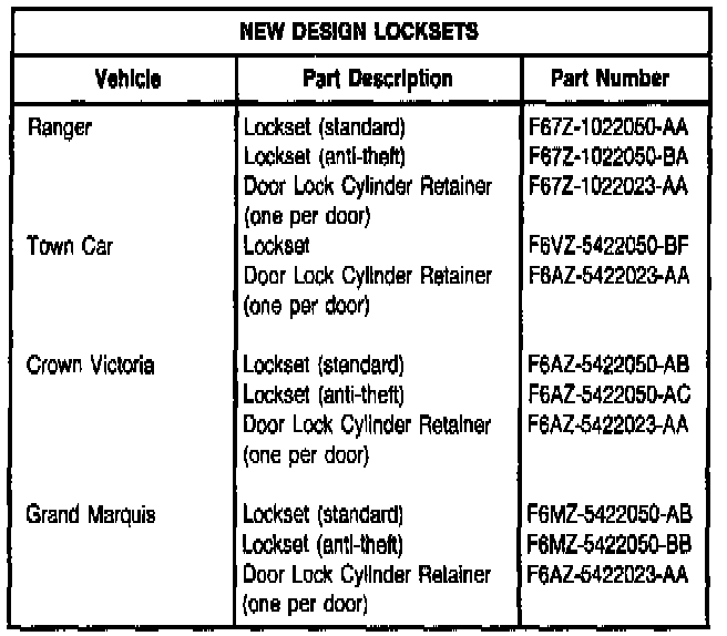 Install new design lockset if replacement of locks are required for vehicles built from the dates listed in the Vehicles with New Lock Designs Chart. Refer to the following Service Procedure for details.