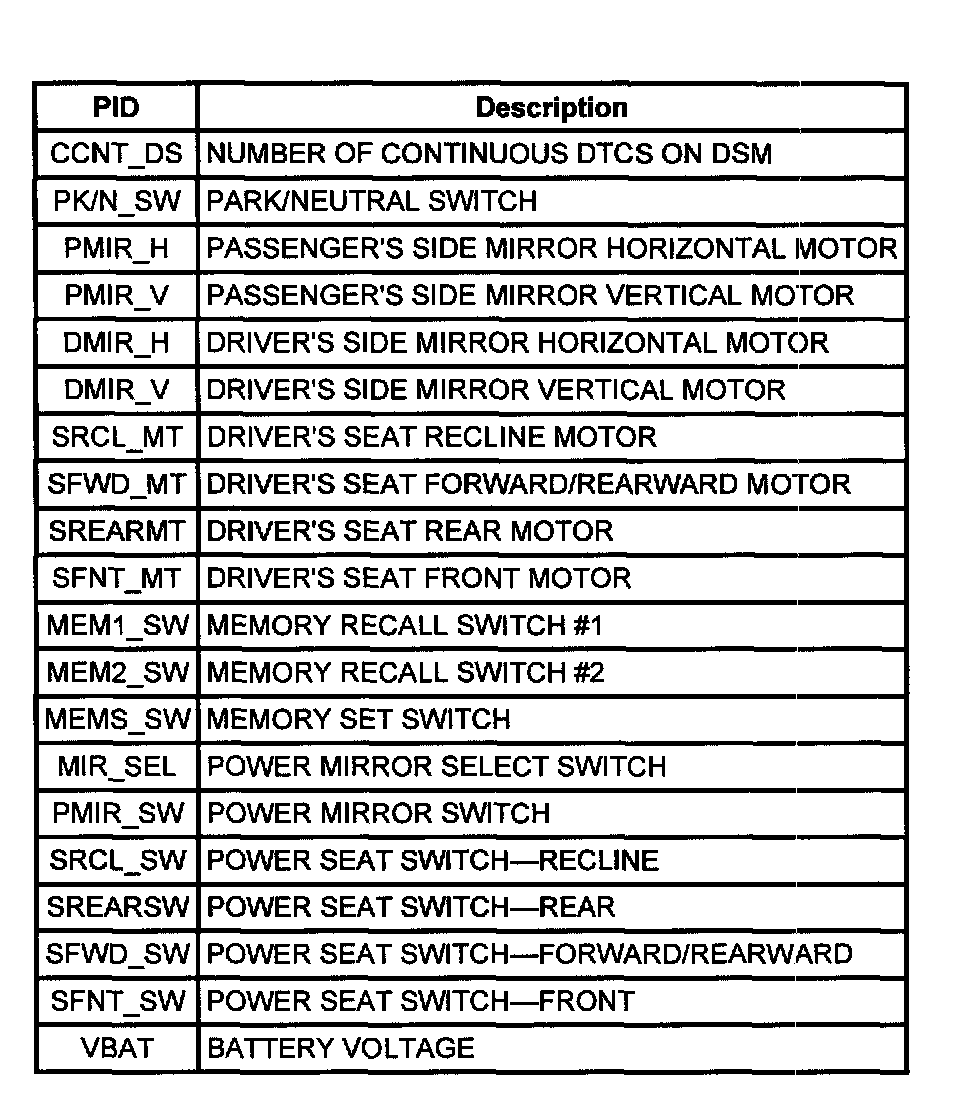 Driver Seat Module (DSM) Parameter Identification (PID) Index