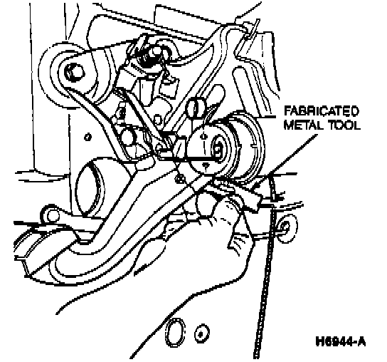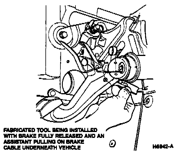 4. With the aid of an assistant, pull down on the parking brake cable, so that the fabricated metal tool can be positioned between the take up reel spring stud and the mounting bracket. This will aid in disconnecting from the reel.