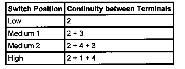 - Remove harness connector from blower switch and check continuity through switch in each position.