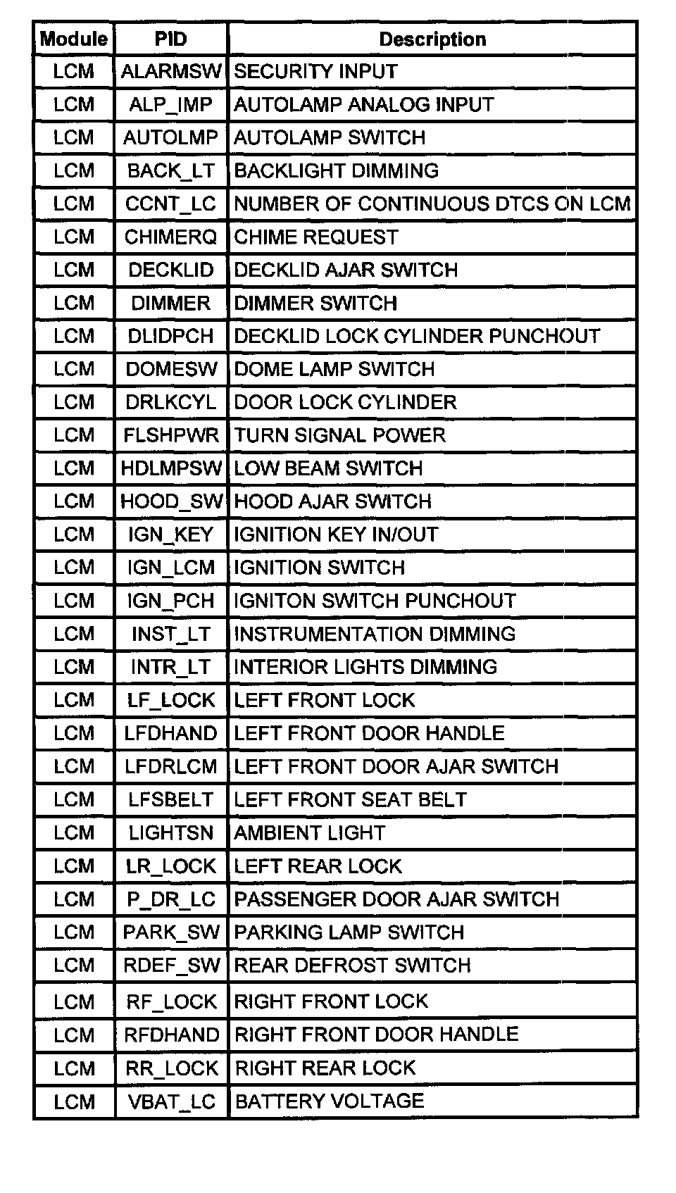 Lighting Control Module (LCM) PID Index: