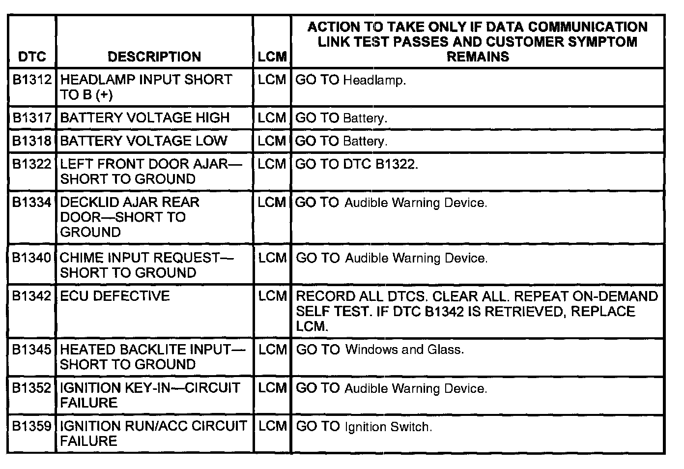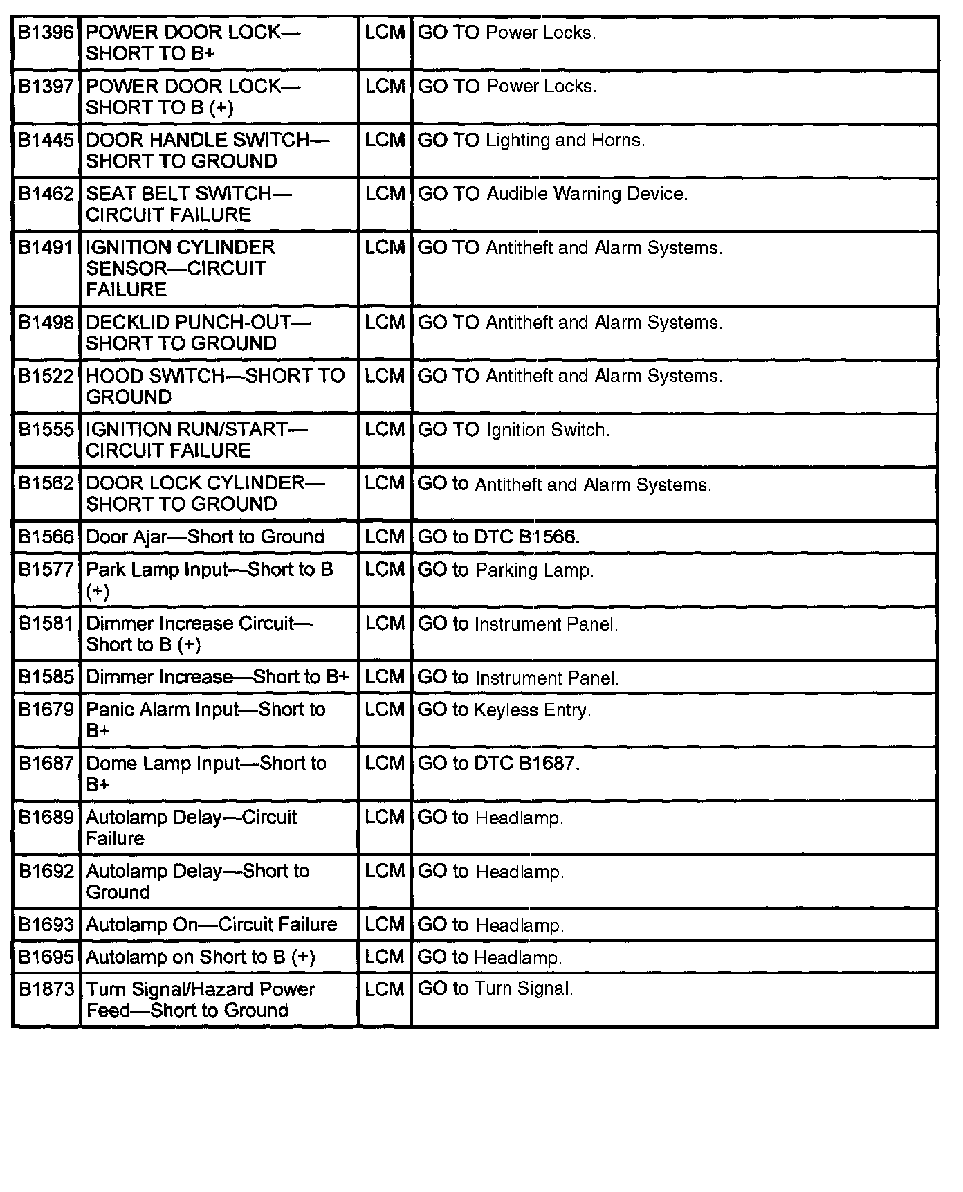 Lighting Control Module (LCM) DTC Index