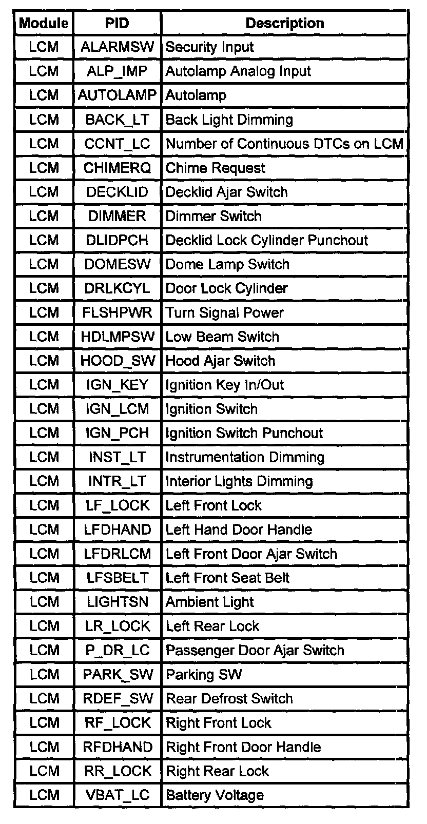 Lighting Control Module PID Index: