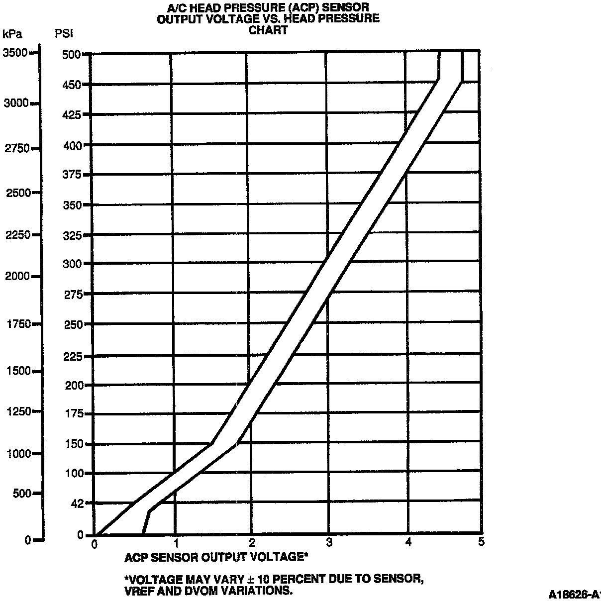 The Air Conditioning Pressure (ACP) sensor is located in the high pressure (discharge) side of the air conditioning A/C system. The ACP sensor provides a voltage signal to the Powertrain Control Module (PCM) that is proportional to the A/C head pressure. The PCM uses this information for A/C clutch control, cooling fan control and idle speed control.