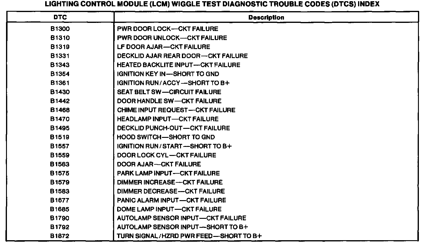 Lighting Control Module Wiggle Test DTC Index