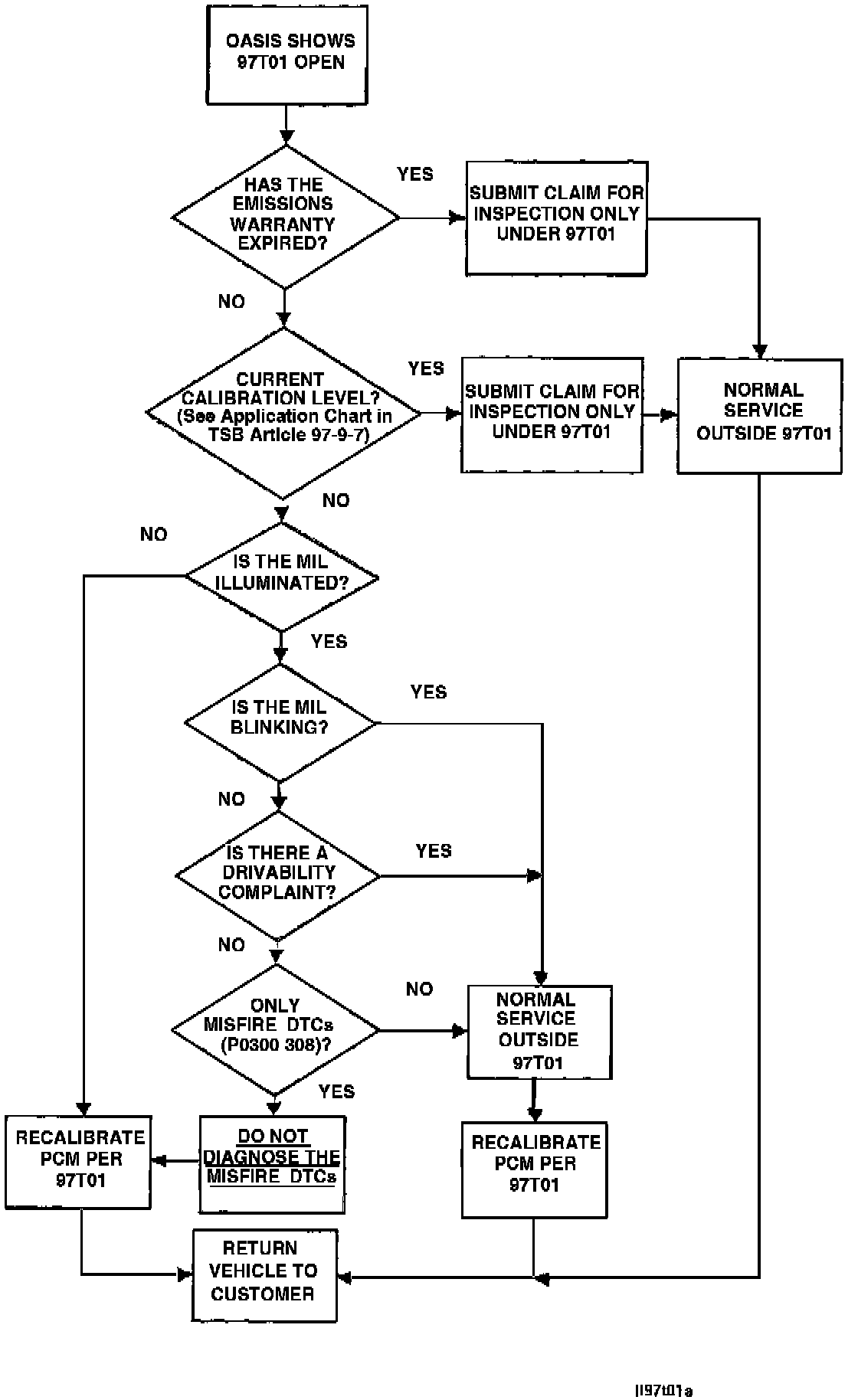 Refer to the decision making chart shown for specific instructions.These Special Service Instructions are only for vehicles as part of applicable emissions warranty time and mileage coverage. If the vehicle is outside the emissions warranty time and mileage limits, do not perform Special Service Instruction 97T01.