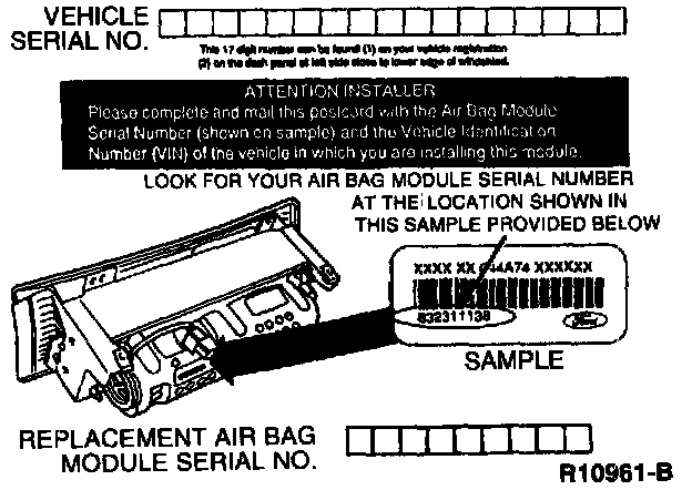 NOTE: When replacing a driver side air bag module or passenger side air bag module, a prepaid return postcard is provided with the replacement driver side air bag module or passenger side air bag module. The serial number for the new part and Vehicle Identification Number (VIN) must be recorded and sent to Ford Motor Company.