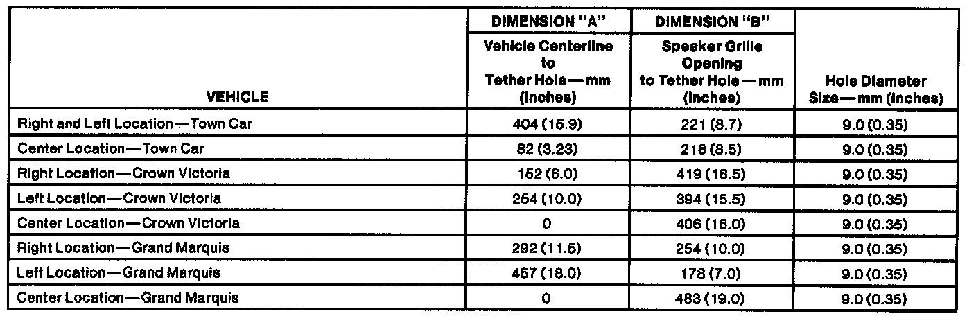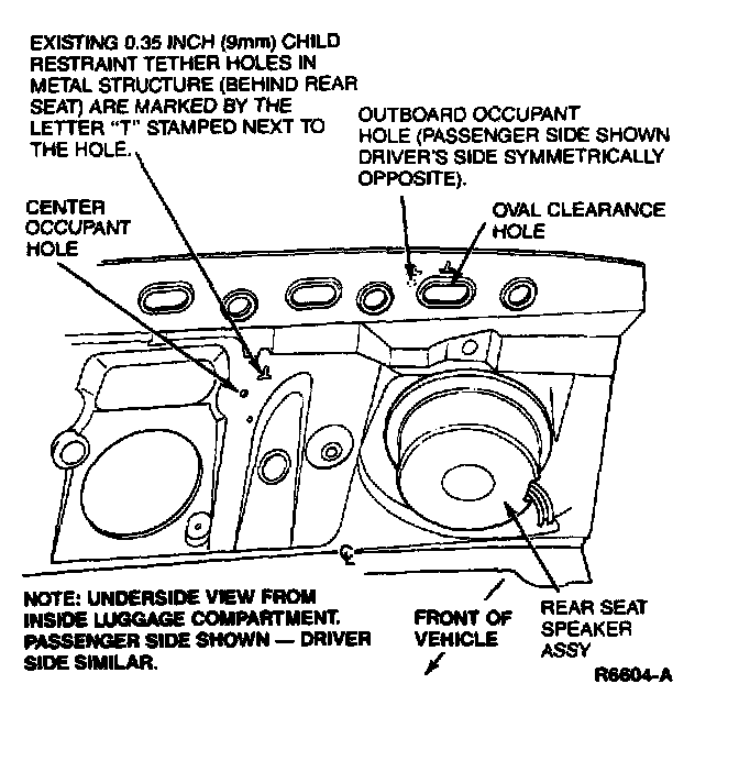From inside the luggage compartment looking underneath the metal panel structure behind the rear seat, locate one of the three existing 9 mm diameter (0.35 inch) holes identified by the letter T. Each outboard hole is located approximately 404 mm (15.9 inches) outboard from the centerline of the vehicle and along a line 221 mm (8.7 inches) rearward from the center of the rear seat radio speaker. The outboard holes are located above the oval clearance holes in the sheet metal. The center passenger tether hole is located 137 mm (5.4 inches) outboard toward the passenger side of vehicle from the centerline of the vehicle and 99 mm (3.9 inches) rearward from the center line of the rear seat radio speaker.