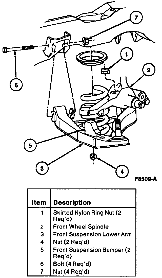 2. Position the front suspension lower arm ball joint stud into the front wheel spindle, and install the new skirted nylon ring nut. Tighten nut to 113-153 N-m (83-113 lb-ft) with a pneumatic tool until skirt curls on outside of nut.