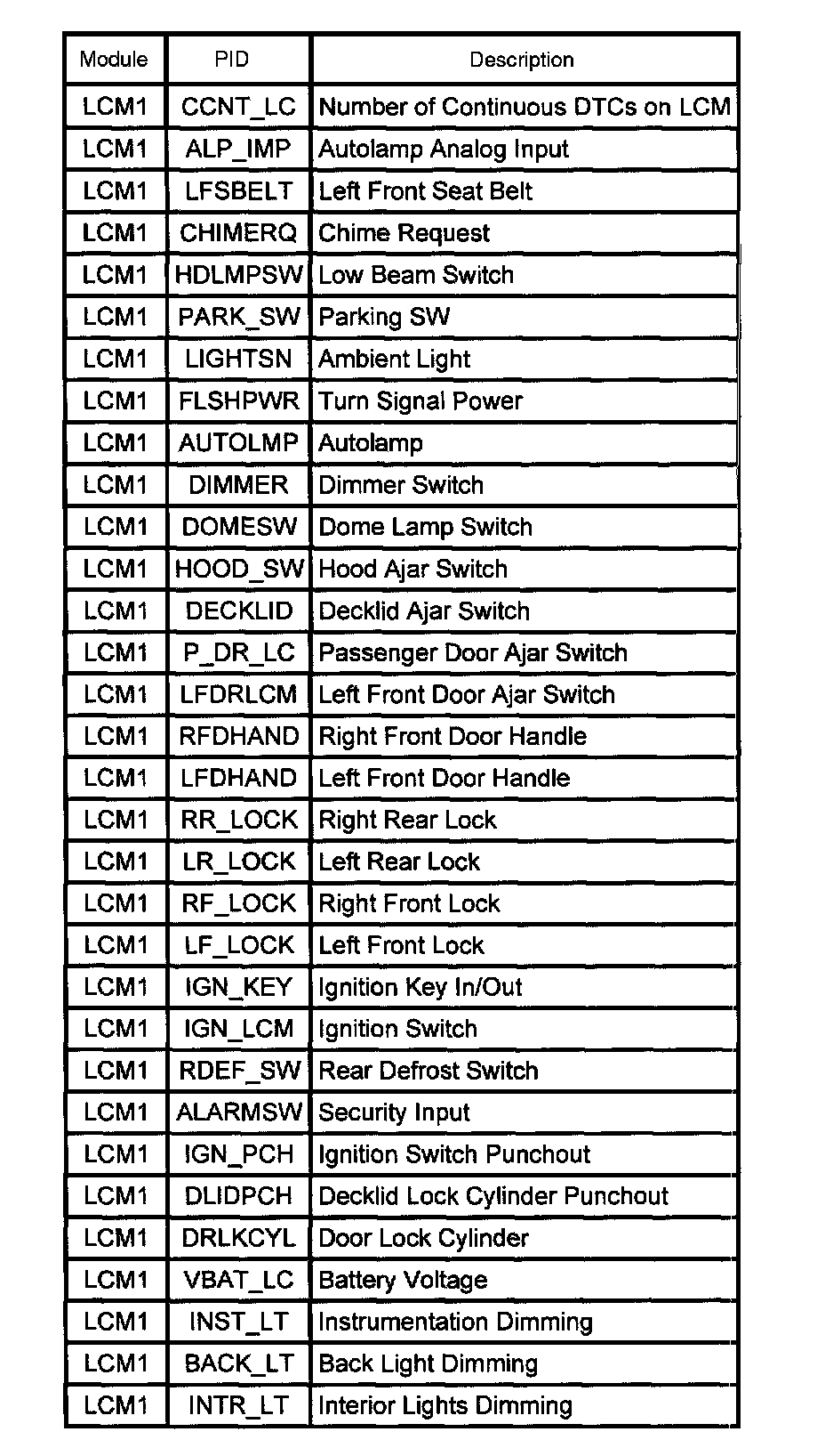 Lighting Control Module (LCM) PID Index: