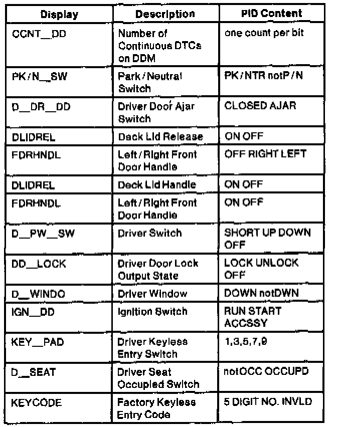 Driver Door Module (DDM) Parameter Identification (PID) Index