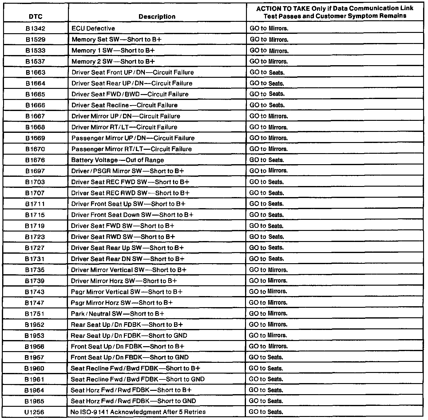 Driver Seat Module DTC Chart