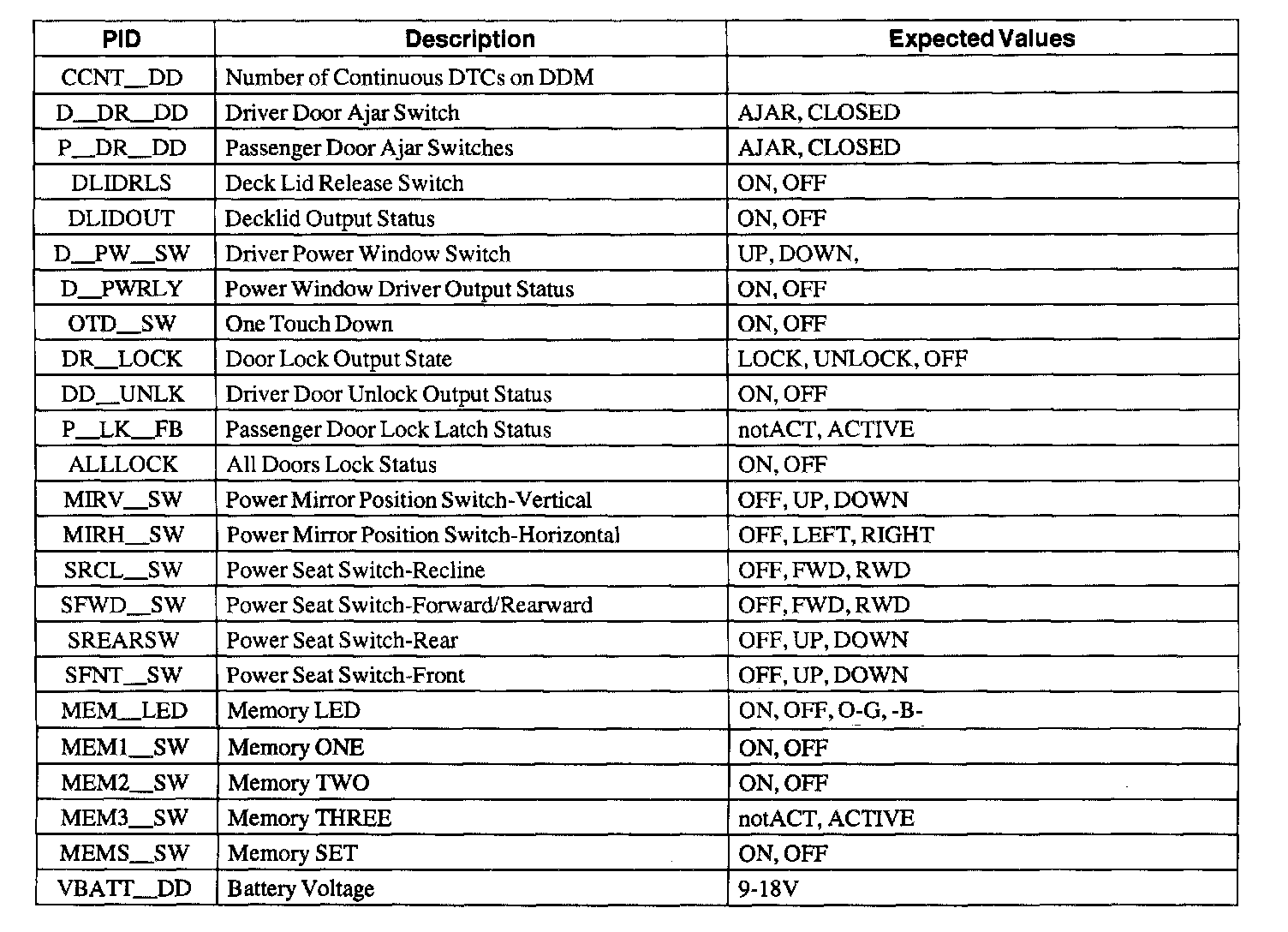 Driver Door Module (DDM) Parameter Identification (PID) Index