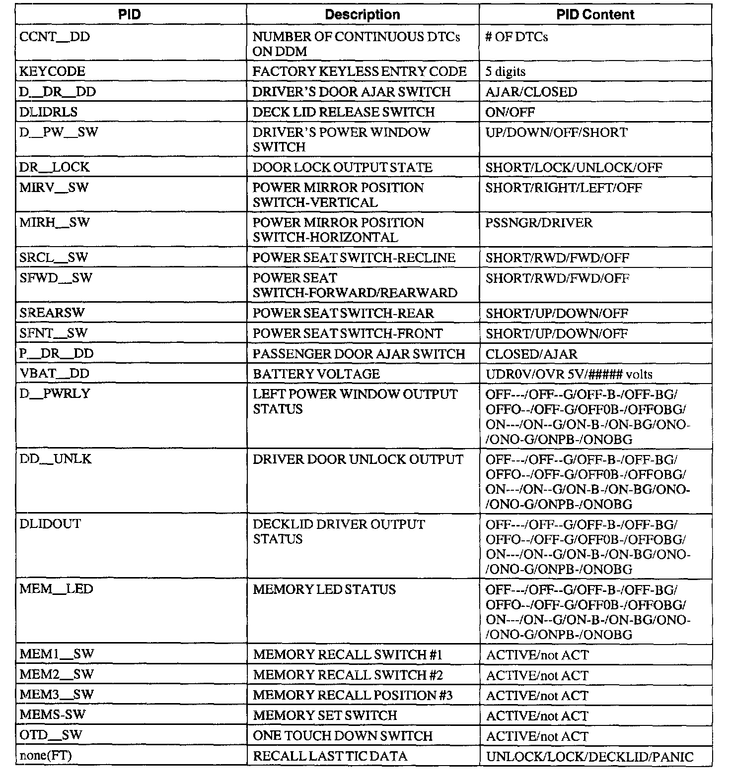 Driver Door Module (DDM) Parameter Identification (PID) Index