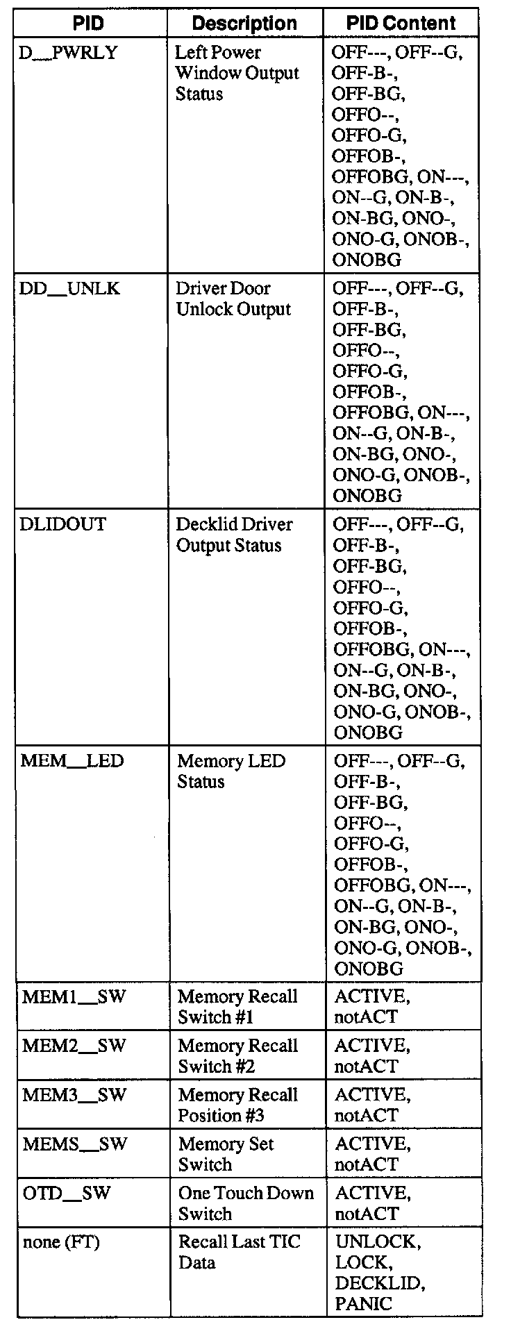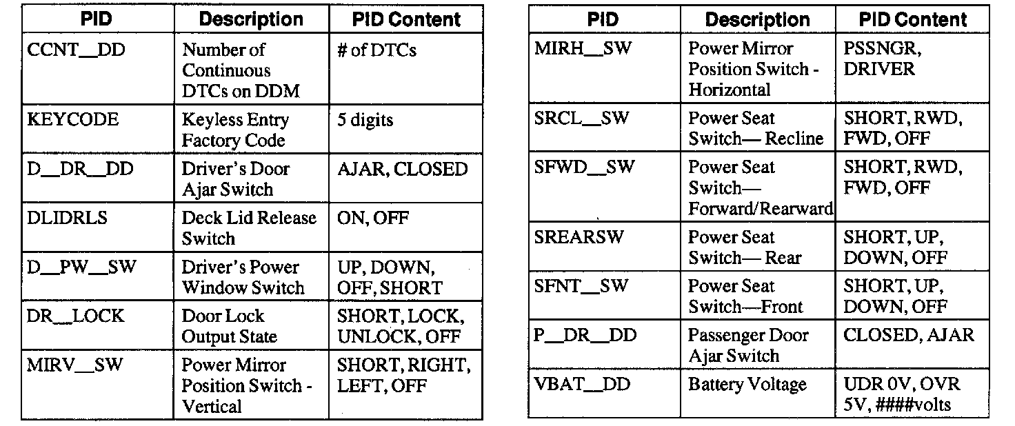 Driver Door Module (DDM) Parameter Identification (PID) Index