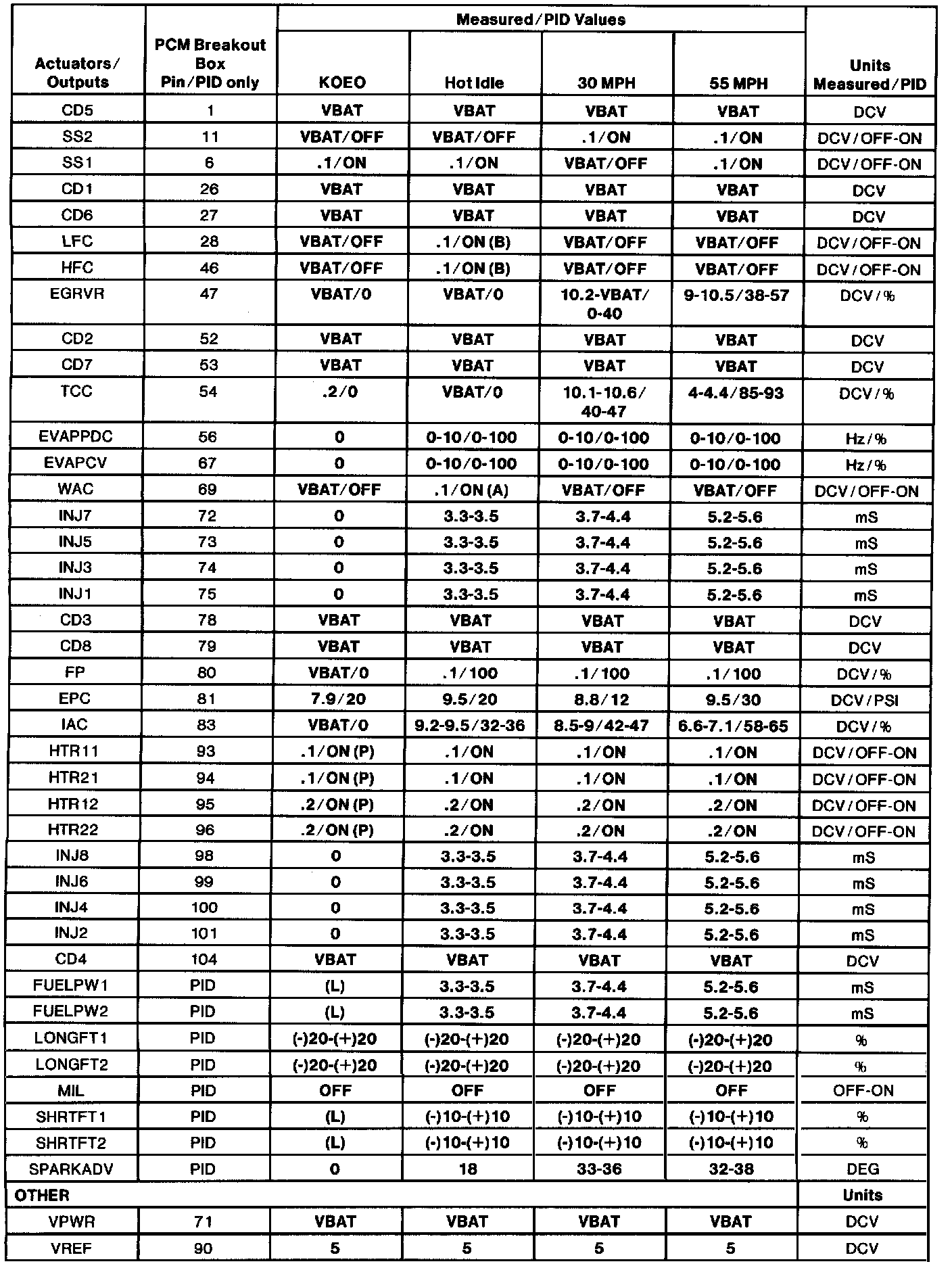 - The Typical Diagnostic Reference Value Charts do not display fault PIDs. These are PIDs which indicate a hard fault with the circuit. They display a value of "YES" or "NO" and are PIDs ending with an "F". These do not include EVAPPF, FF, MAF or VREF.