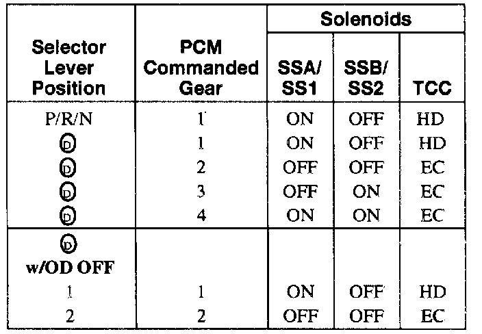 Two on/off shift solenoids provide gear selection of first through fourth gears by controlling the pressure to the three shift valves. One unit containing the two shift solenoids is located in the main control valve body. The shift solenoids are two-way normally closed style.