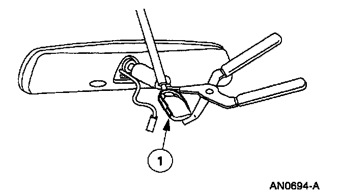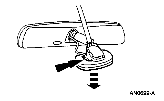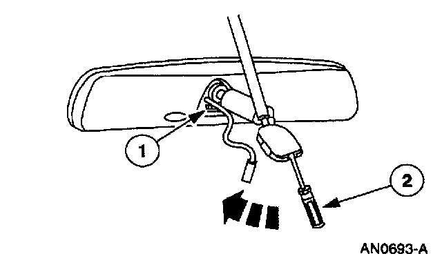 2. Insert a small flat-blade screw driver into the slot at the base of the inside rear view mirror. Hold the inside rear view mirror and pull the screwdriver rearward until the inside rear view mirror snaps off the inside rear view mirror bracket.