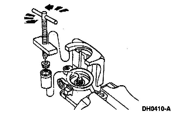 - Unload the spring tension from the parking brake lever pin retainer clip and spring cover using Screw and Cross Block, a 6-mm washer head nut and a 1/2-inch drive 14-mm socket.