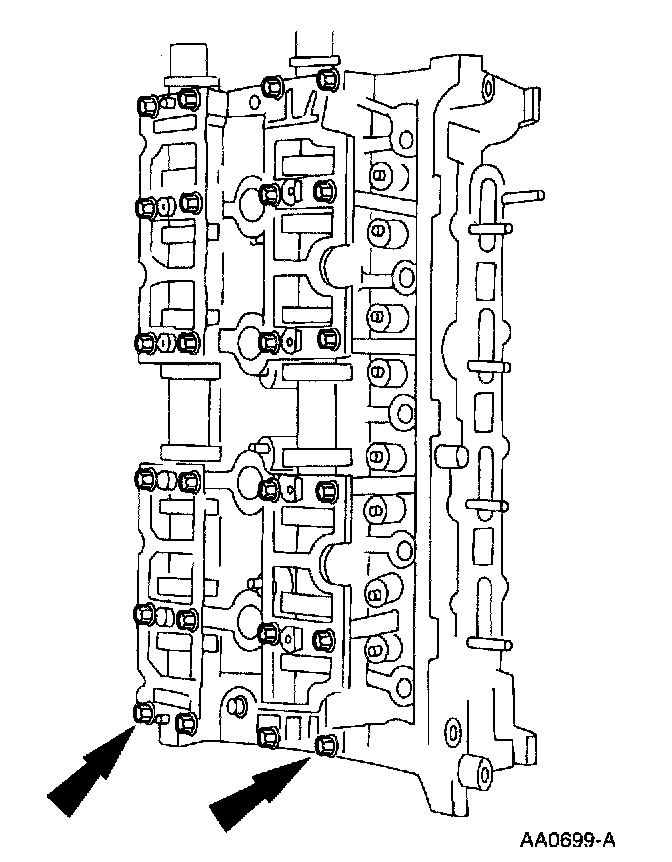9. CAUTION: The outer cam bearing cap (exhaust) bolts are longer and must be returned to the same location or possible engine damage may occur.