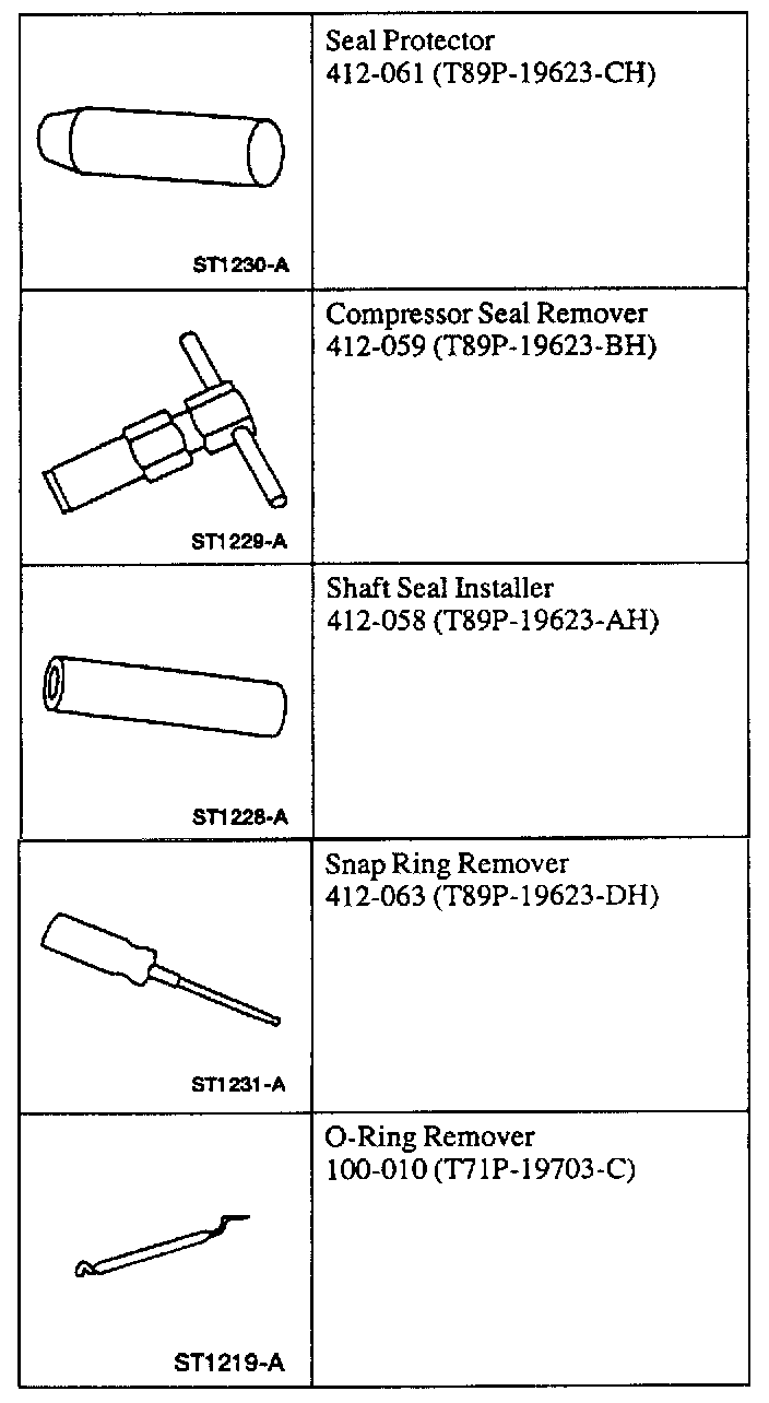 2. Place the shaft seal on the Seal Protector. Lubricate the shaft seal and the Shaft Seal Protector with PAG Compressor Oil YN-12c, F7AZ-19589-DA or equivalent meeting Ford specification WSH-M1C231-B.