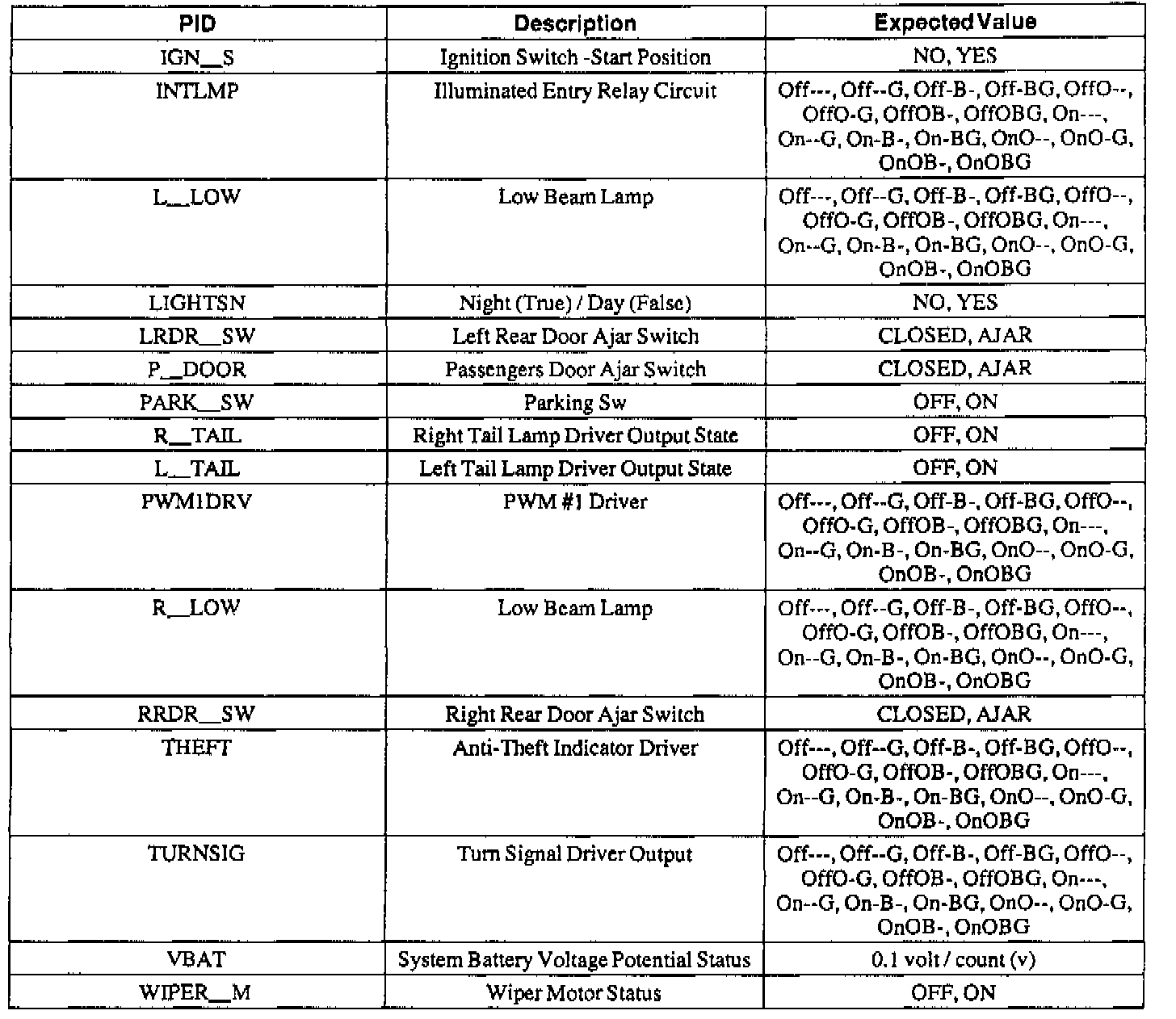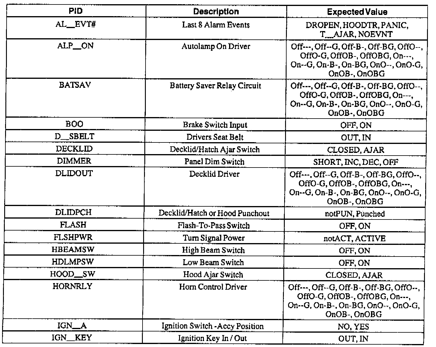 Pinout Values and Diagnostic Parameters