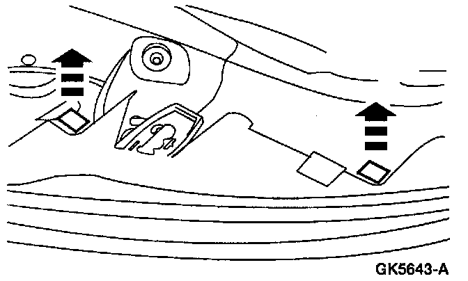 ^ Be sure the headlamp assembly is positioned correctly with the alignment pins inserted into the proper holes and onto the ribs of the reinforcement.