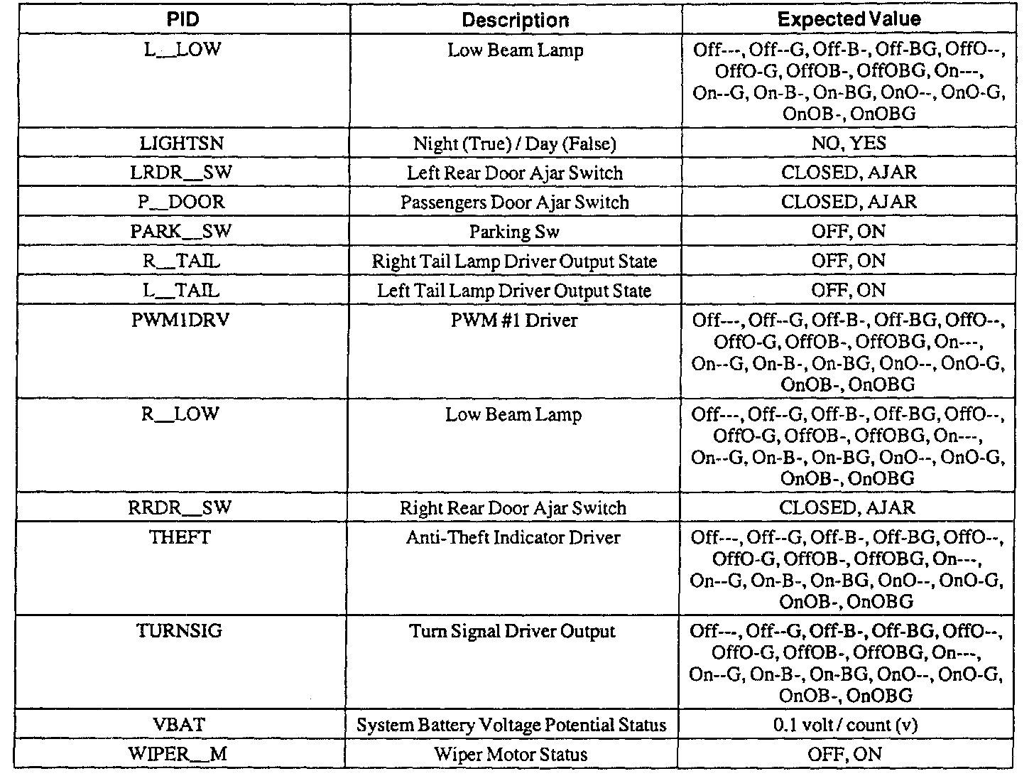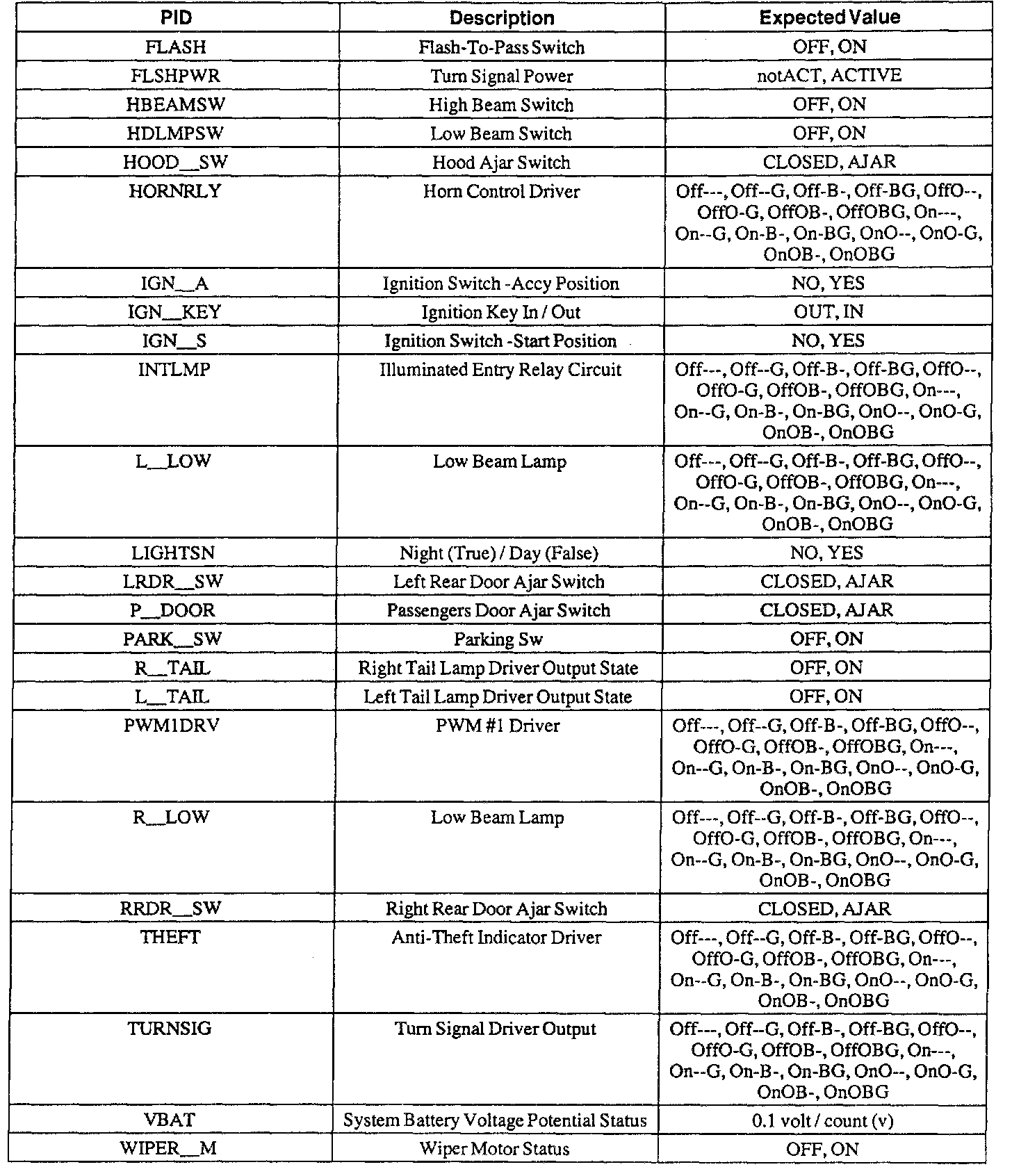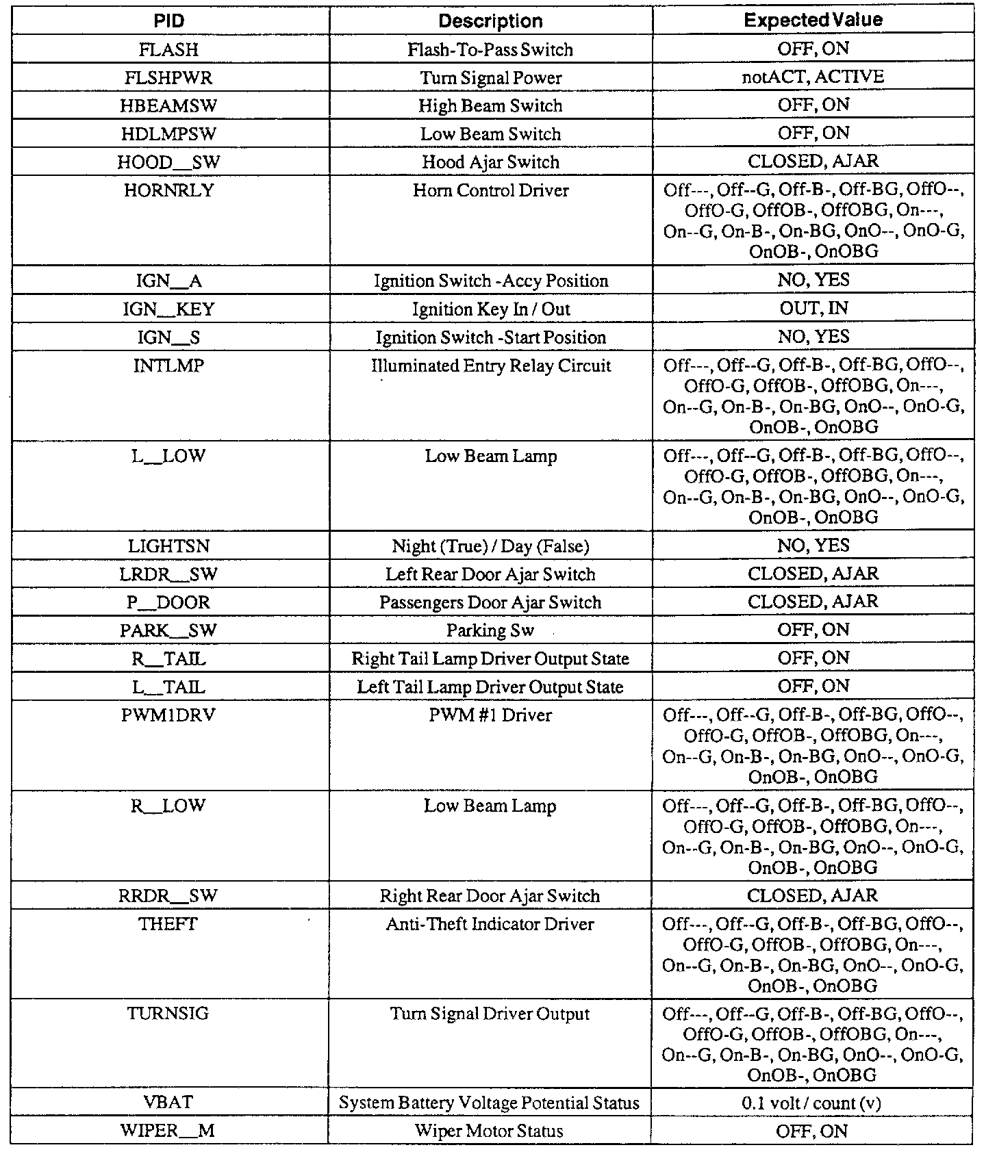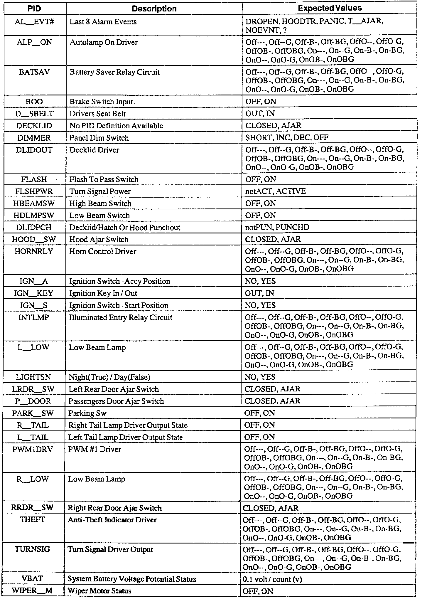 Pinout Values and Diagnostic Parameters