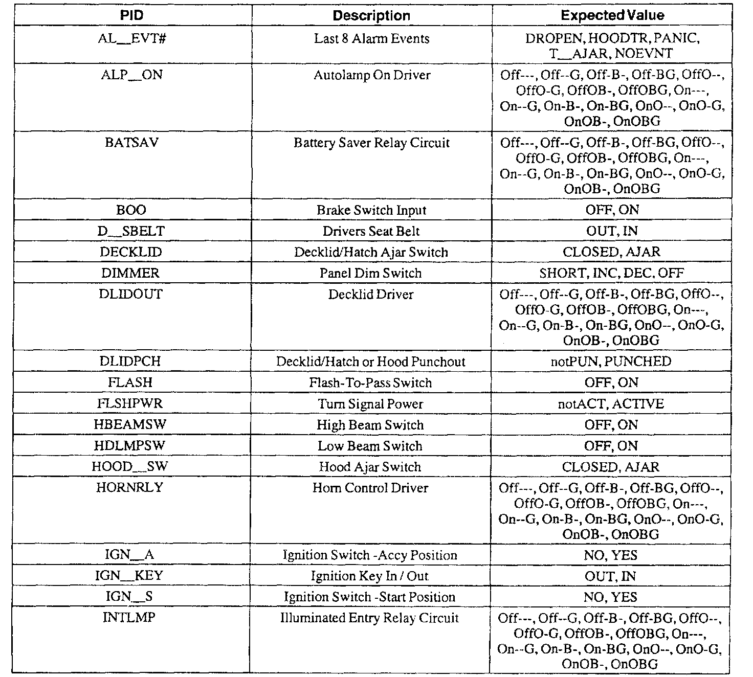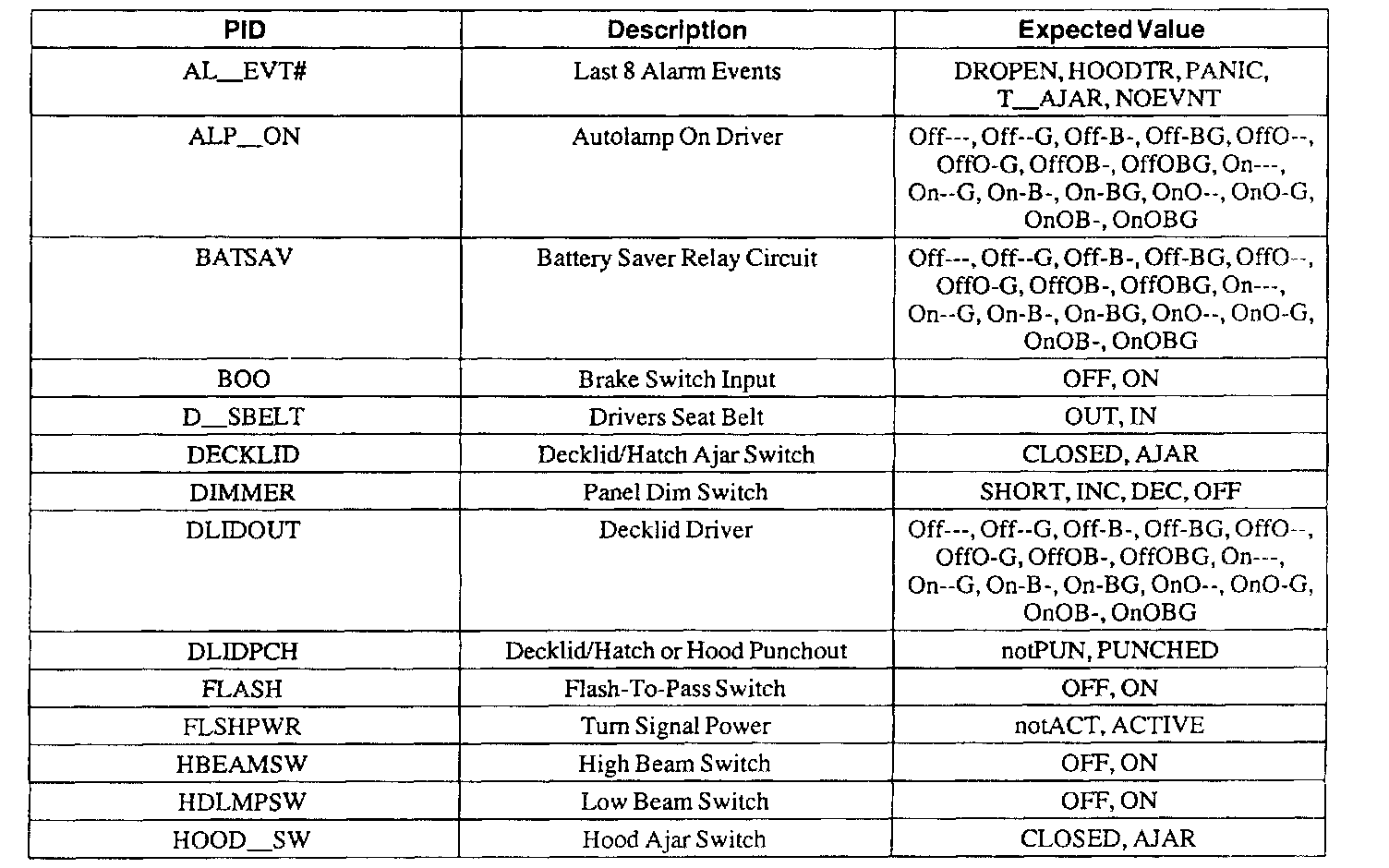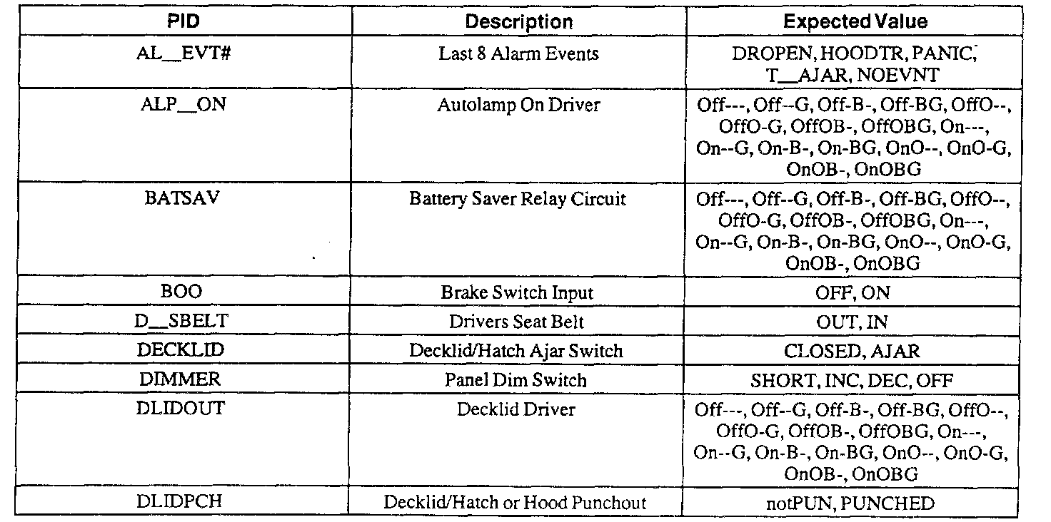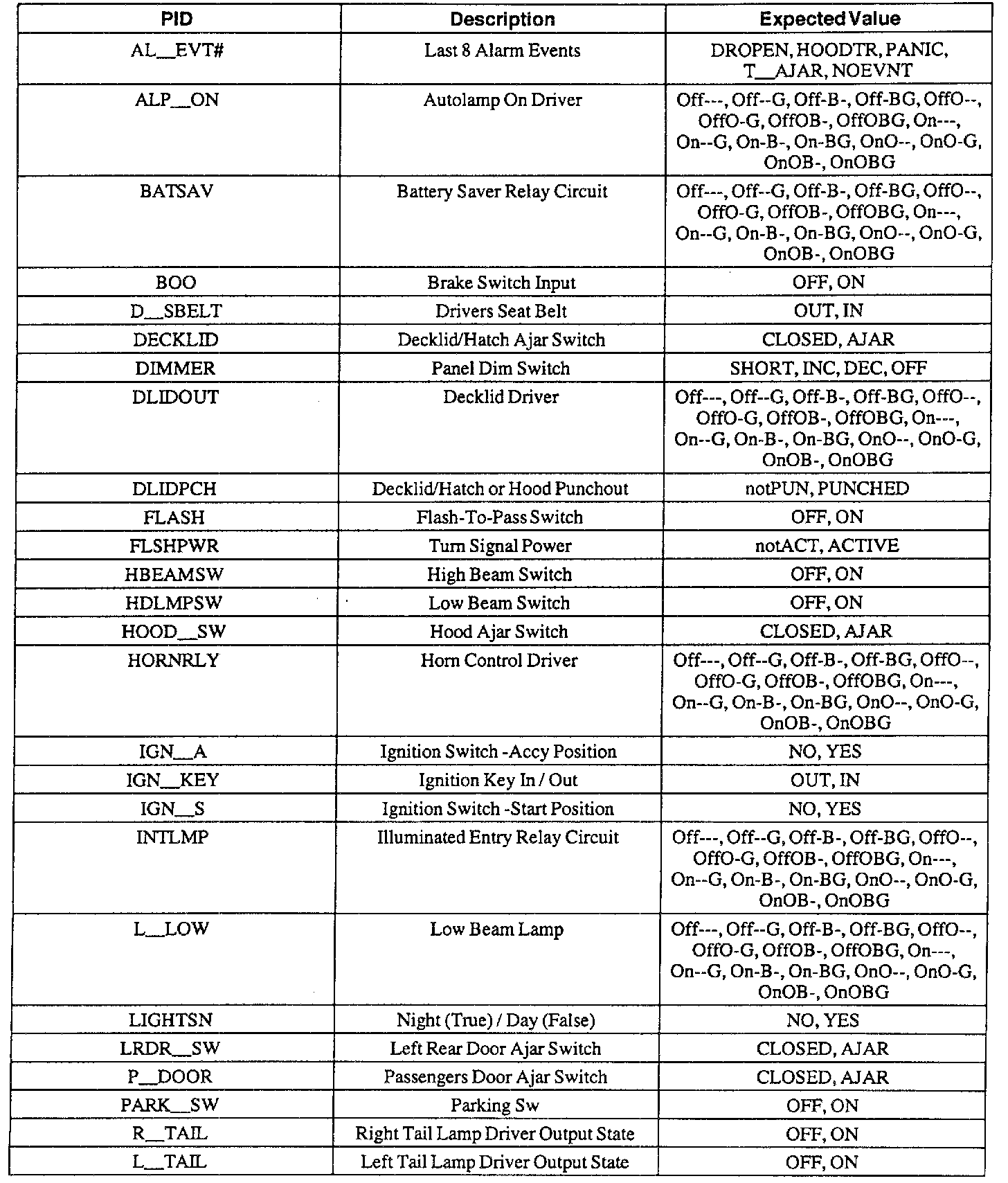Pinout Values and Diagnostic Parameters
