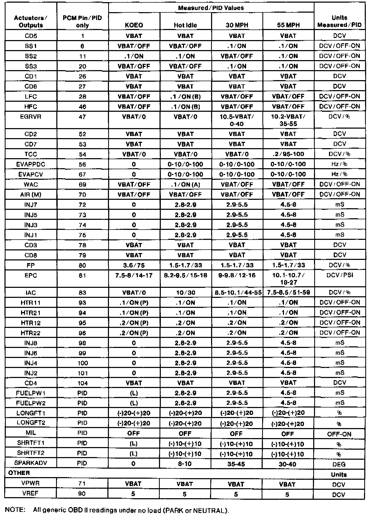 GENERIC OBD II PID VALUES