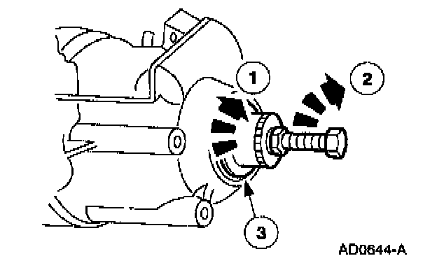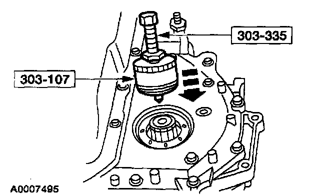 ^ Install the Front Cover Seal Remover and 5 1/2 inch forcing screw (part of Crankshaft Seal Replacer/Cover Aligner) into left differential seal.