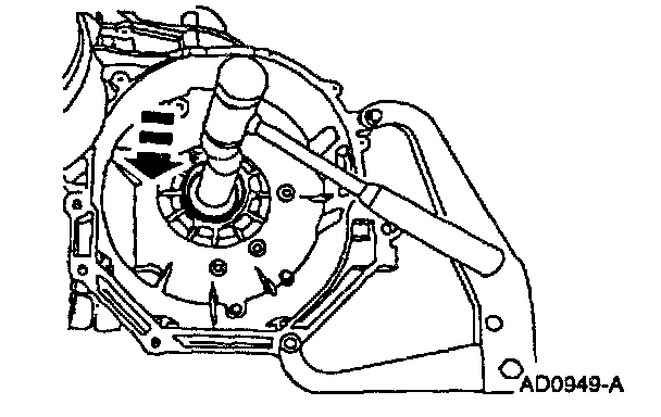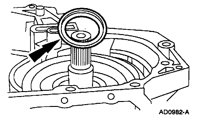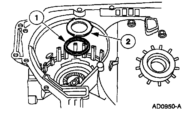 NOTE: Make sure that the beveled retaining ring seats properly in case groove with the bevel down and final drive support must be visible on the inside diameter of the retaining ring but must not seat against the case wall.