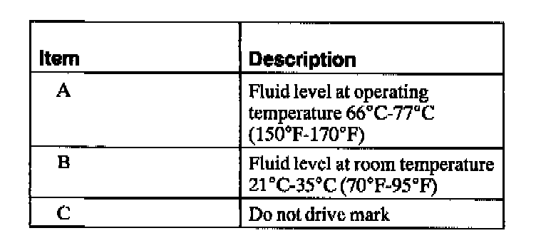 NOTE: The fluid level reading on the fluid level indicator will differ depending on operating and ambient temperatures. The correct reading should be within the normal operating temperature range.