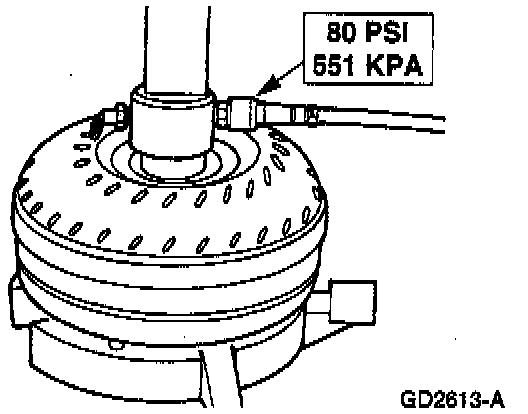 With air pressure applied to the valve, inspect for leaks at the converter hub, seams and studs. A soap bubble solution may be applied around Hose areas to aid in diagnosis. If any leaks are present, replace converter.