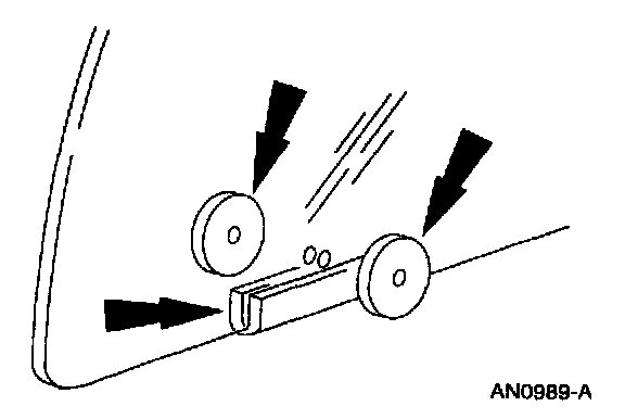 CAUTION: Prior to removing the rivet center pins, a suitable block support should be inserted between the door outer panel and the glass to stabilize the glass during the rivet pin removal. Use a 1/4-inch diameter drill to drill out the remainder of the rivet, using care not to enlarge the sheet metal holes or damage the plastic retainer and spacer.