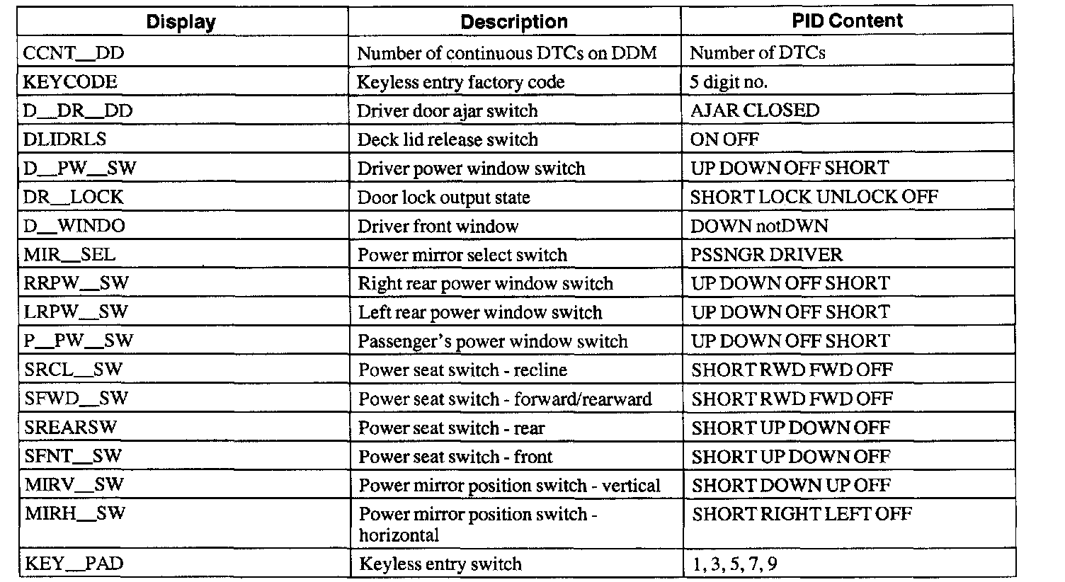 Driver Door Module (DDM) Parameter Identification (PID) Index