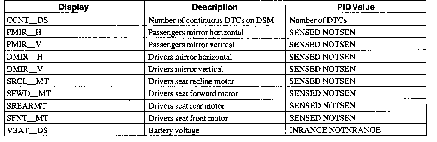 Driver Seat Module (DSM) Parameter Identification (PID) Index