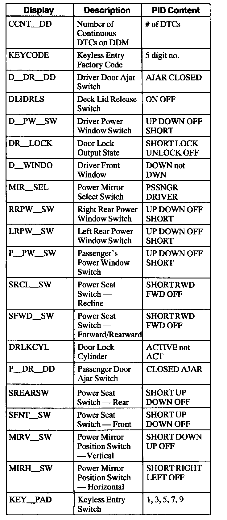 Driver Door Module (DDM) Parameter Identification (PID) Index