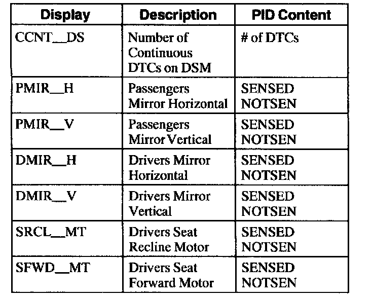 Driver Seat Module (DSM) Parameter Identification (PID) Index