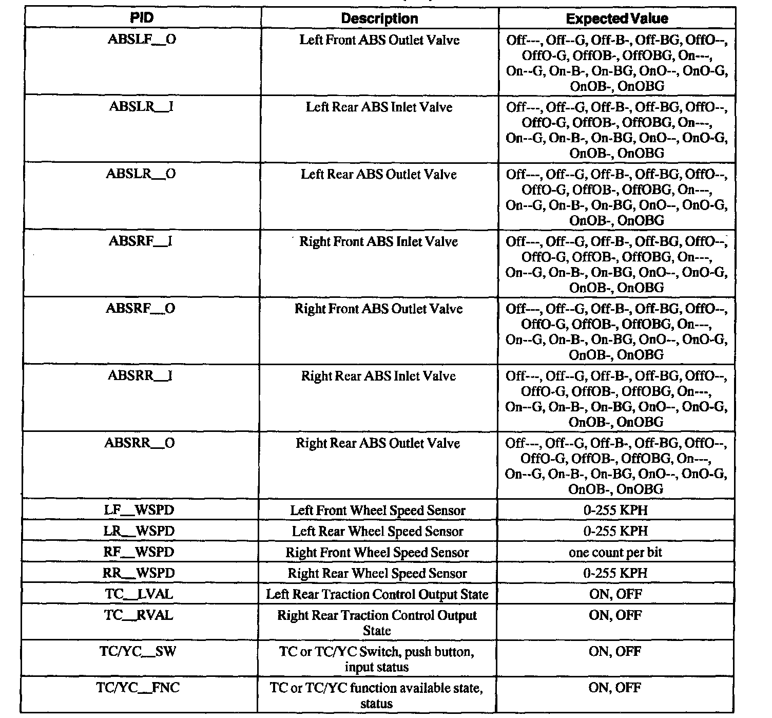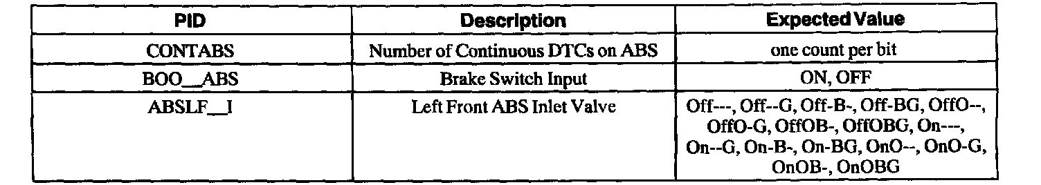 ABS Control Module Parameter Identification (PID) Index