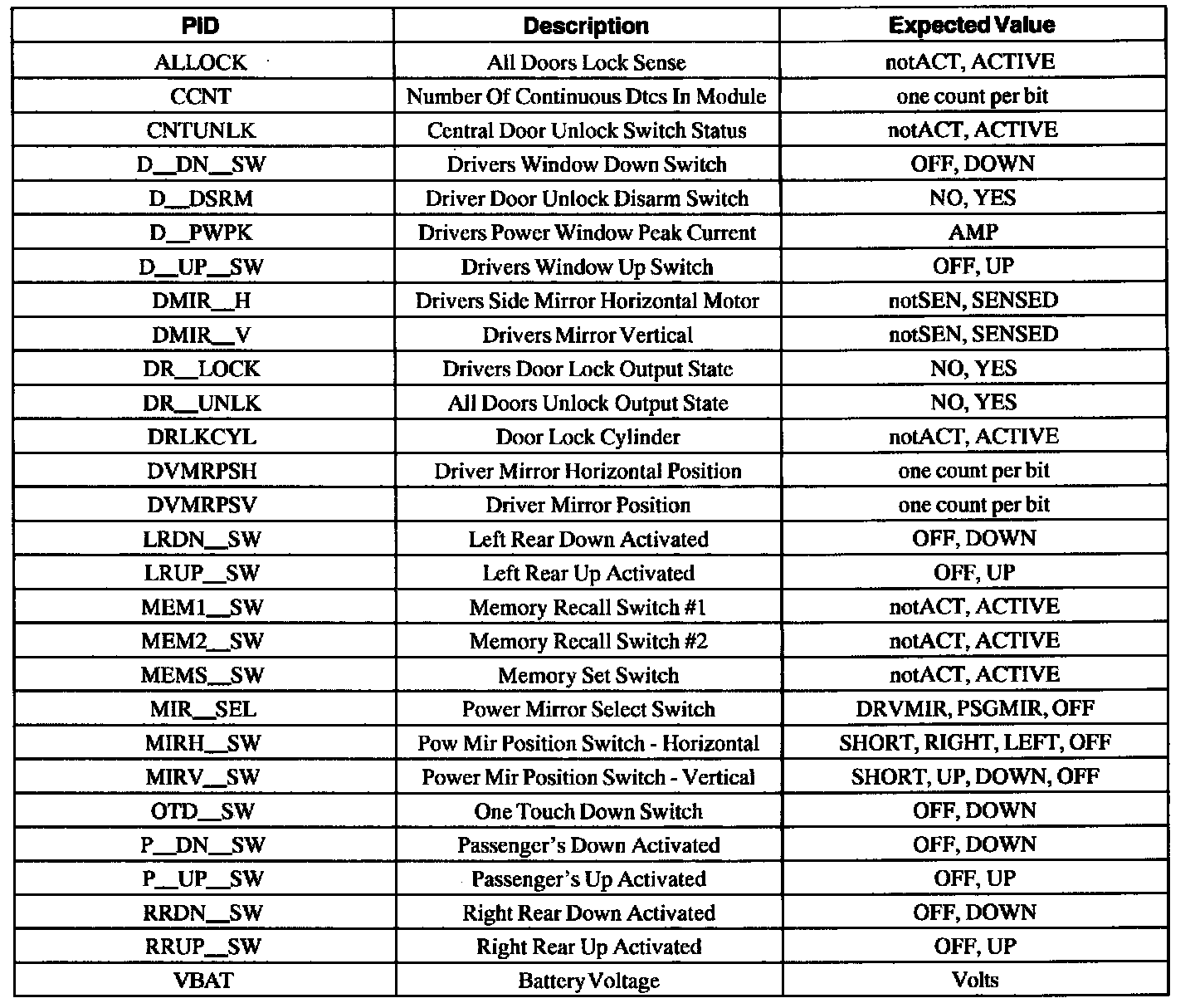 Driver Door Module (DDM) Parameter Identification (PID) Index