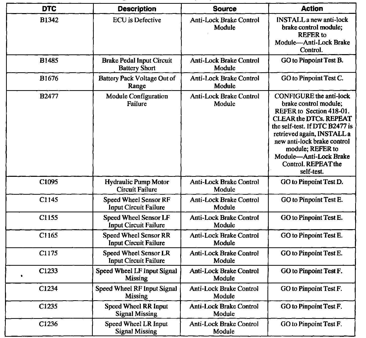 Anti-Lock Brake Control Module Diagnostic Trouble Code (DTC) Index