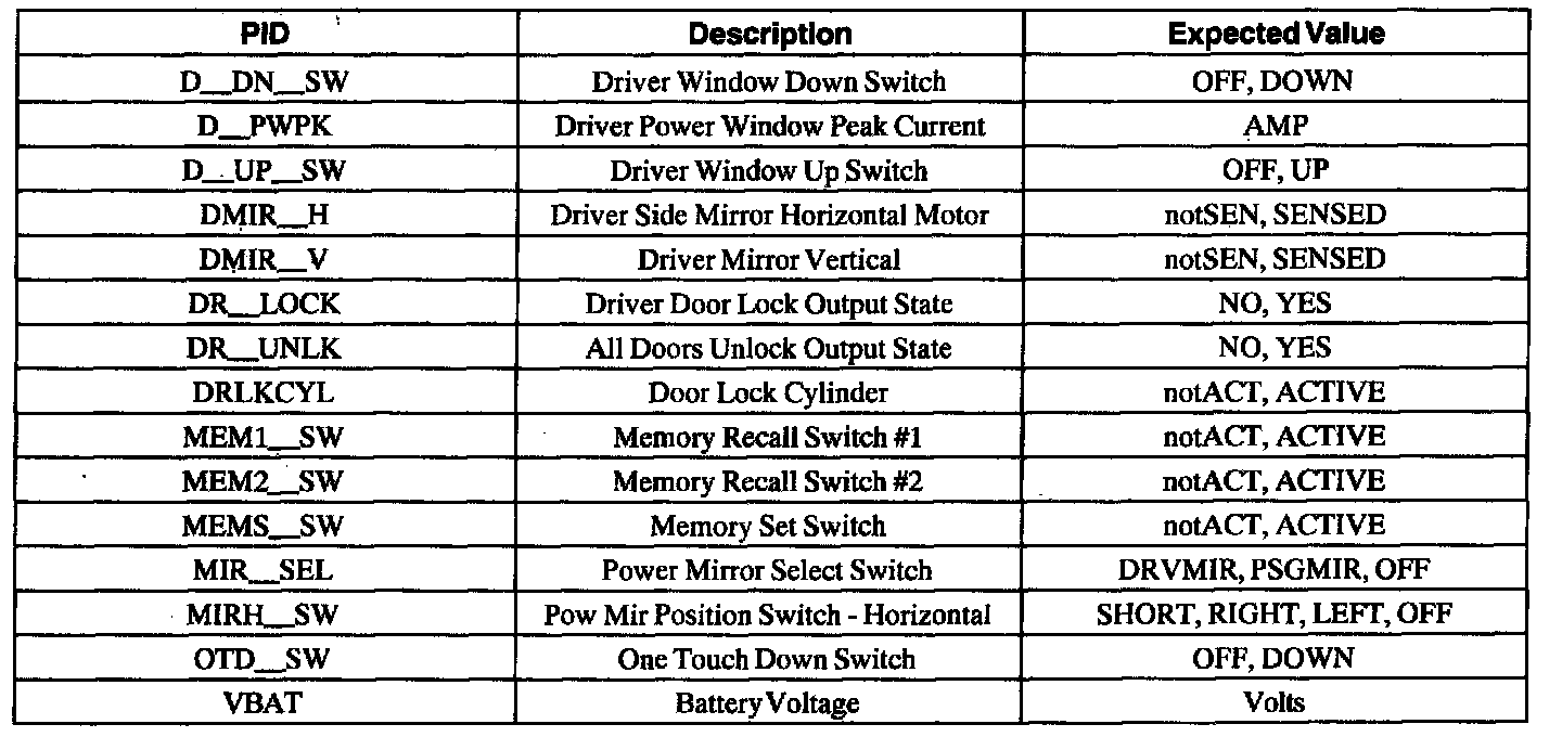 Driver Door Module (DDM) Parameter Identification (PID) Index