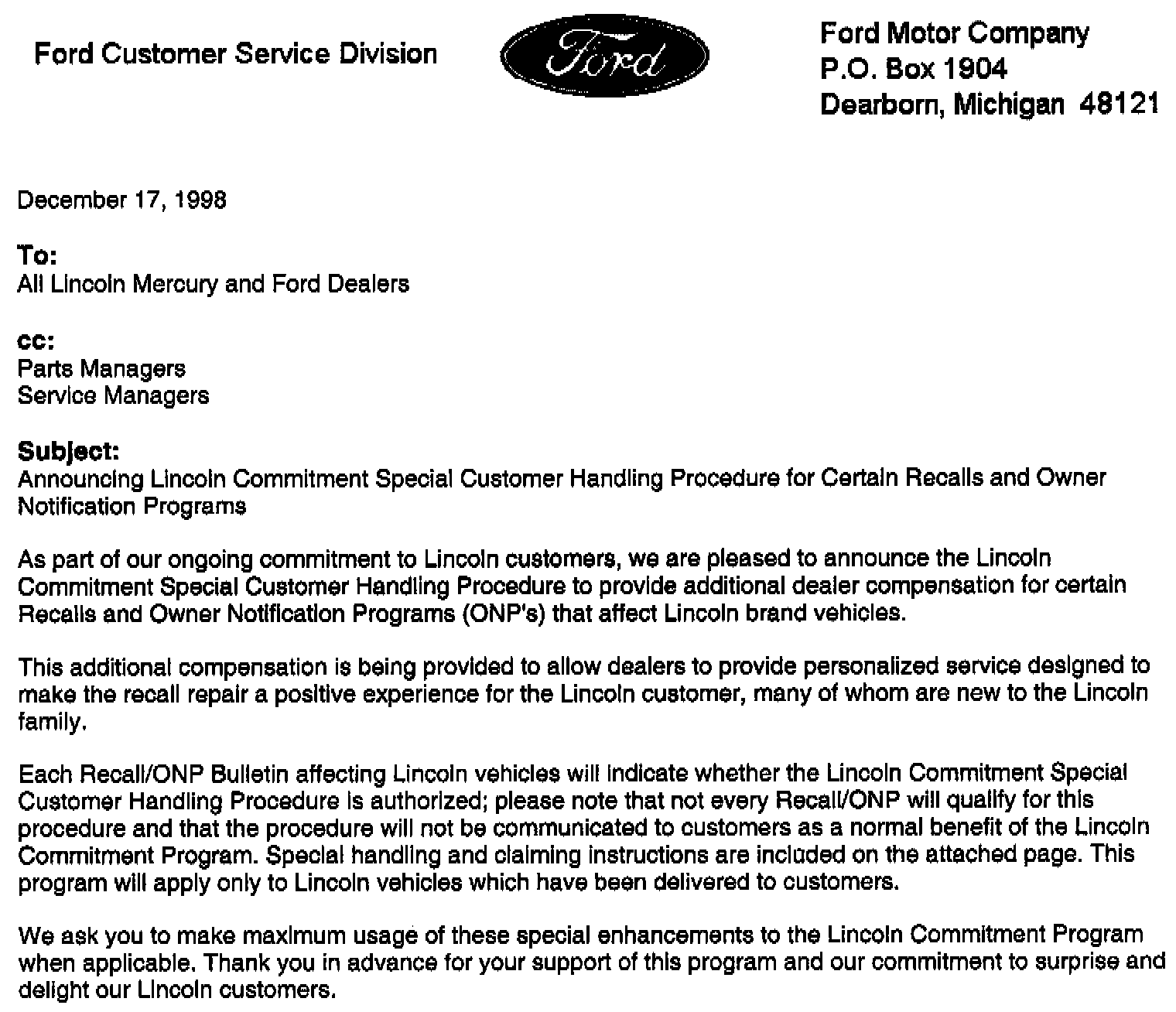 Attachment IV - Special Handling Procedure Announcement