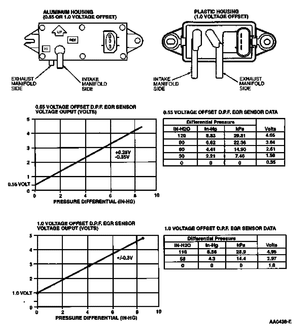 The differential pressure feedback EGR sensor (Figure 82) is a ceramic, capacitive-type pressure transducer that monitors the differential pressure across a metering orifice located in the orifice tube assembly. The differential pressure feedback sensor receives this signal through two hoses referred to as the downstream pressure hose (REF SIGNAL) and upstream pressure hose (HI SIGNAL). The HI and REF hose connections are marked on the aluminum differential pressure feedback EGR sensor housing for identification (note that the HI signal uses a larger diameter hose). The differential pressure feedback EGR sensor outputs a voltage proportional to the pressure drop across the metering orifice and supplies it to the PCM as EGR flow rate feedback.