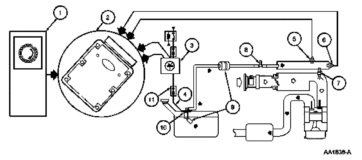 The fuel system consists of a fuel tank with reservoir, fuel pump, fuel rail pressure sensor, fuel filter, fuel supply line, engine fuel temperature sensor, fuel rail, fuel injectors, and schrader/pressure test point. Operation of the system is as follows (Figure 59) and (Figure 60):
