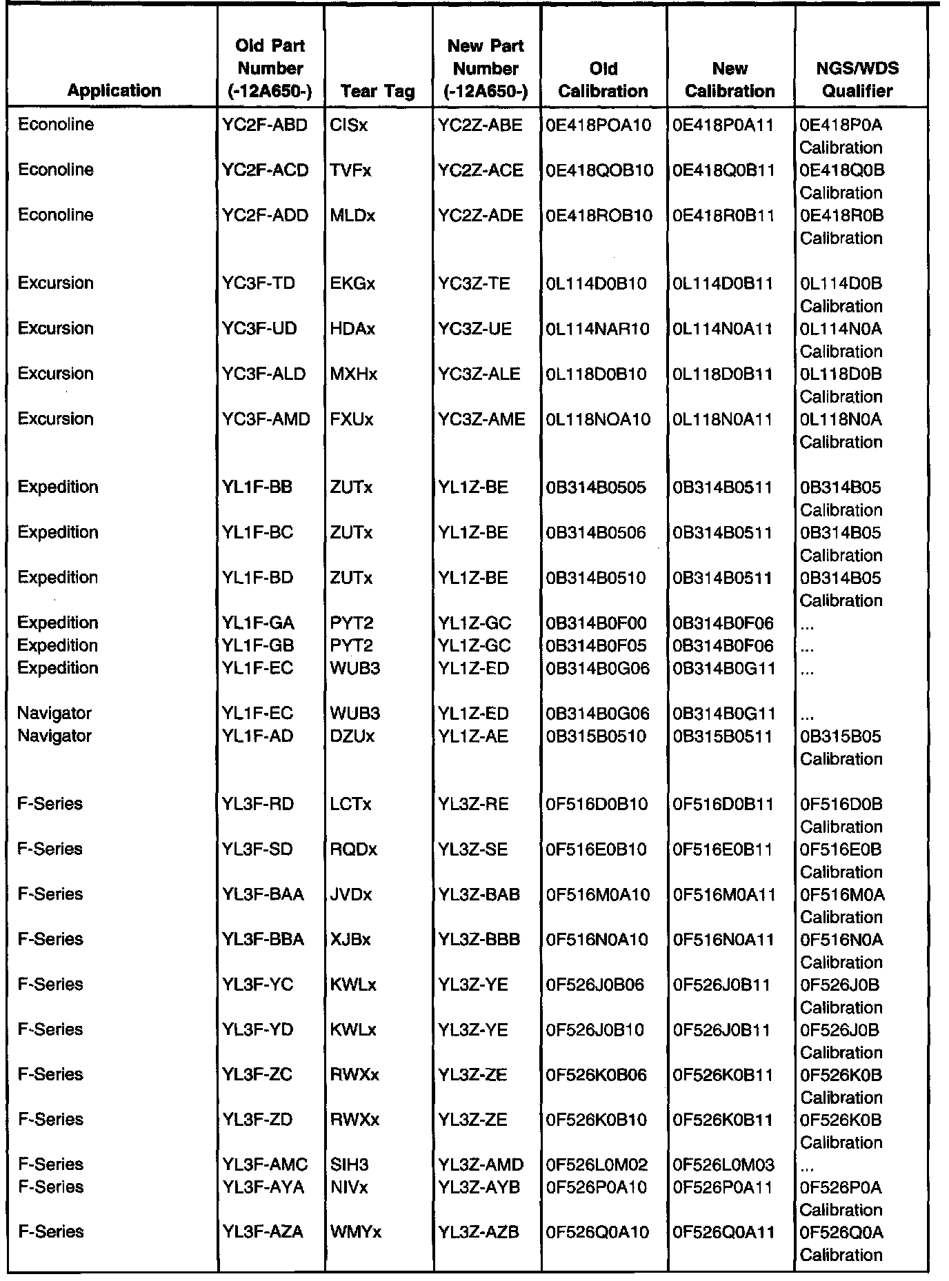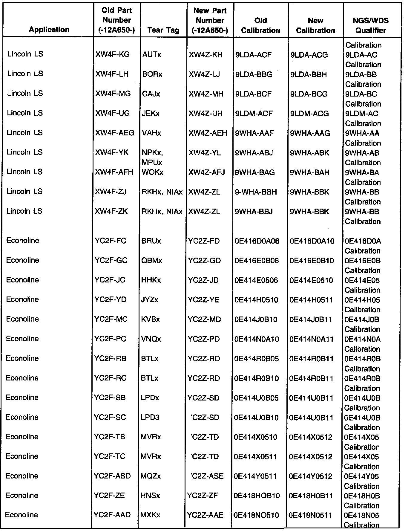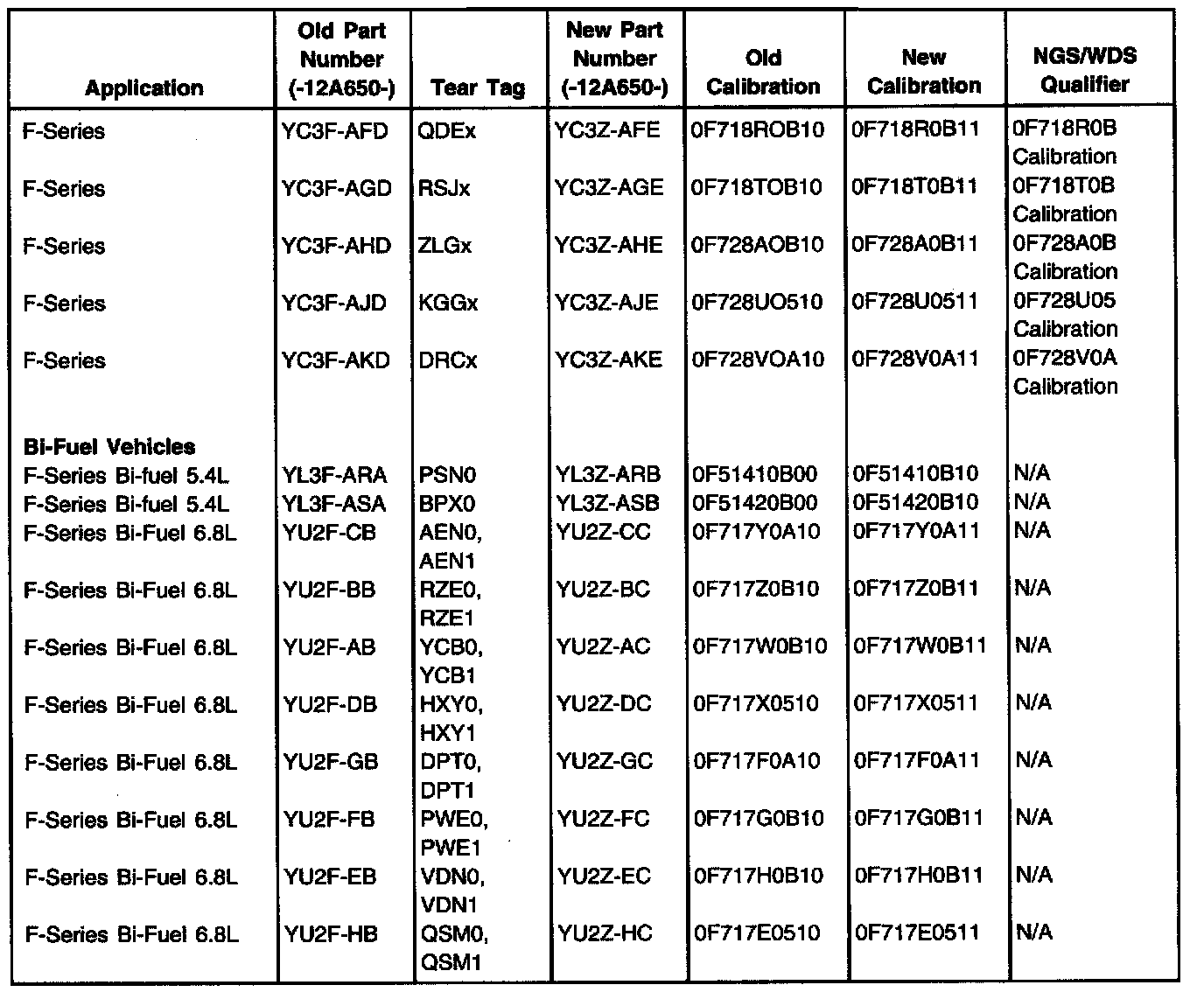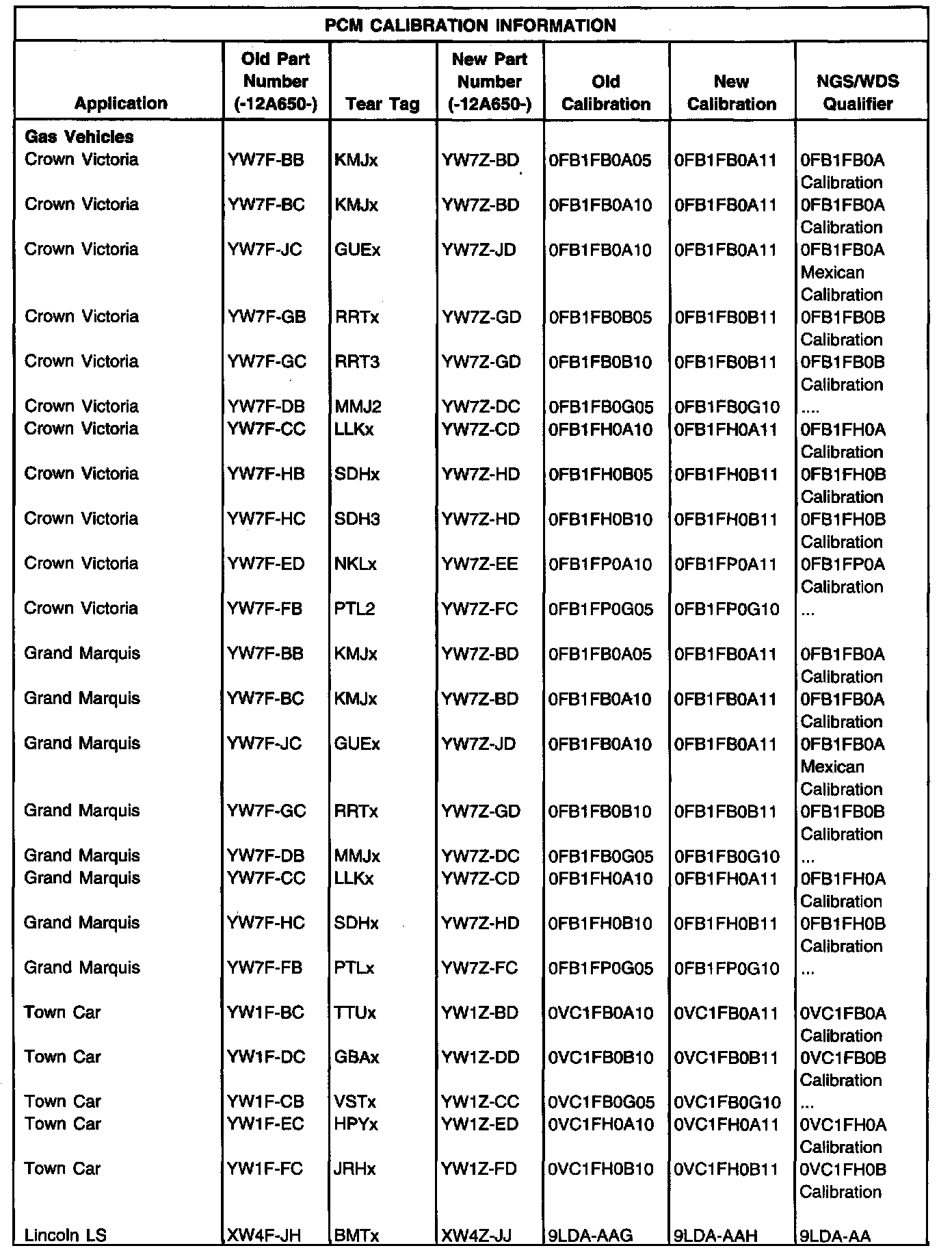 Perform normal diagnostics. If normal diagnostics cannot pinpoint the condition and no other concerns are found, reprogram the PCM using the Worldwide Diagnostic System (WDS) or New Generation Star (NGS) Tester. Refer to the PCM Calibration Information Chart as shown.